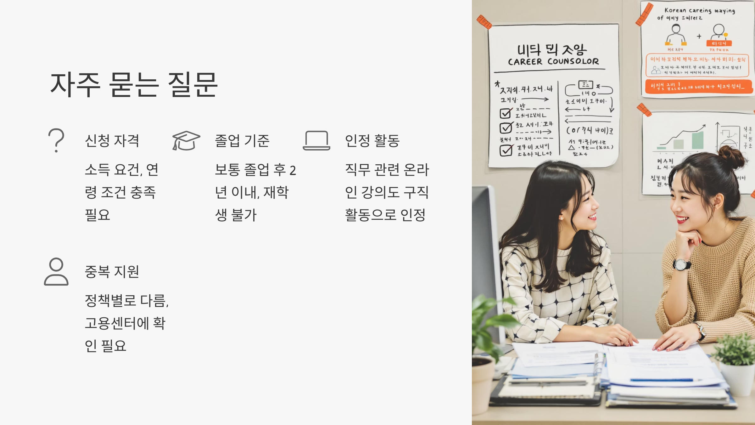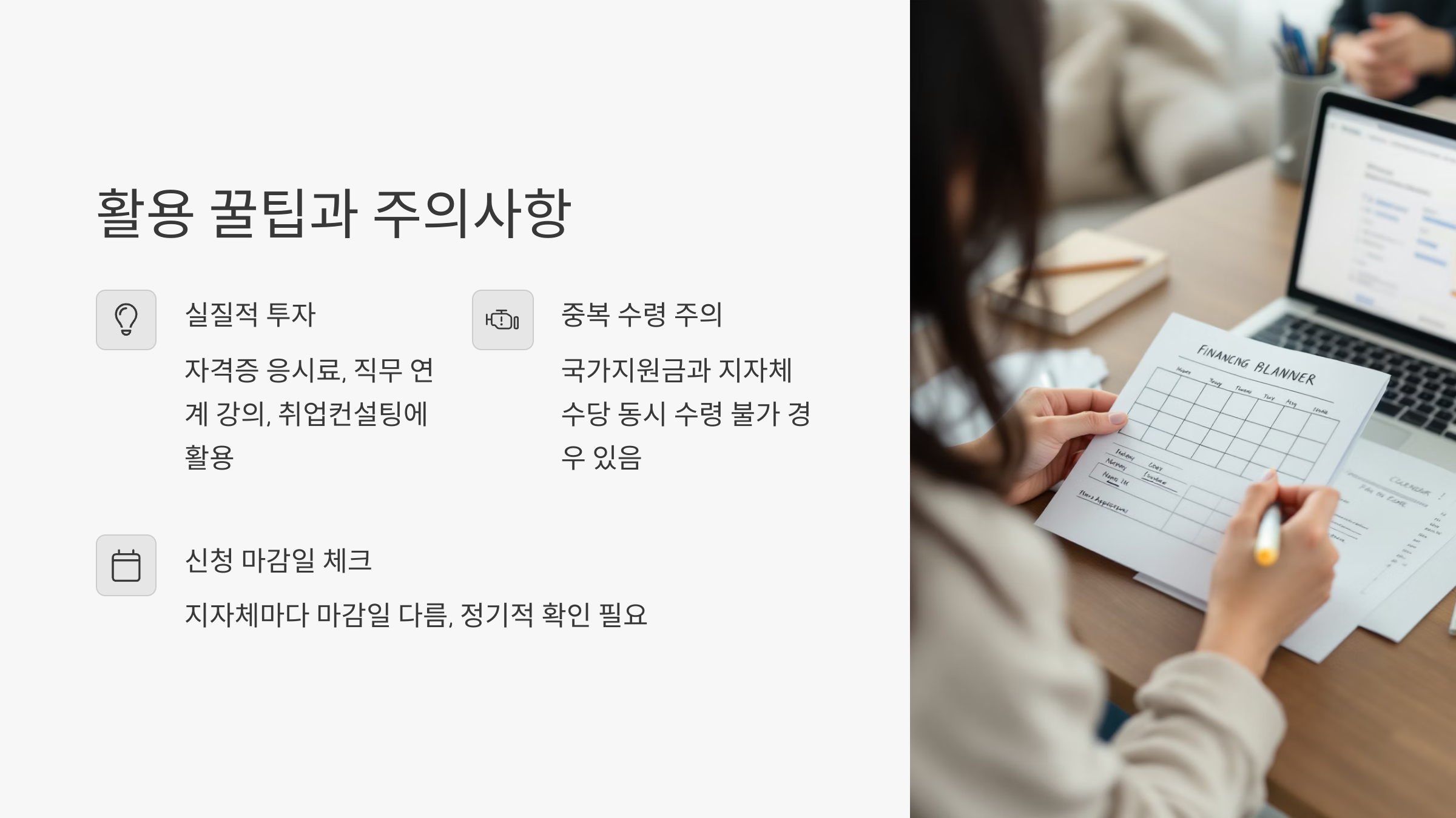 활용 팁 하나! 지원금을 단순히 생활비로 쓰기보다, 실질적인 투자에 쓰면 좋아요. 예를 들어, 자격증 응시료, 직무 연계 온라인 강의, 취업컨설팅 같은 서비스에 쓰면 효과가 훨씬 커요. 실제로 이런 항목은 지출증빙 없이 인정되기도 하니까 적극 활용해보세요.