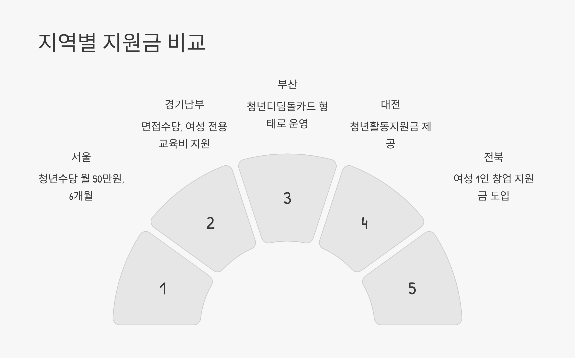 서울은 ‘청년수당’이 유명하고, 경기남부 지역은 ‘청년 면접수당’이나 ‘여성 전용 교육비 지원’도 있어요. 부산은 ‘청년디딤돌카드’, 대전은 ‘청년활동지원금’ 형태로 운영 중이에요. 전북 지역은 최근 여성 1인 창업 지원금도 도입했어요.