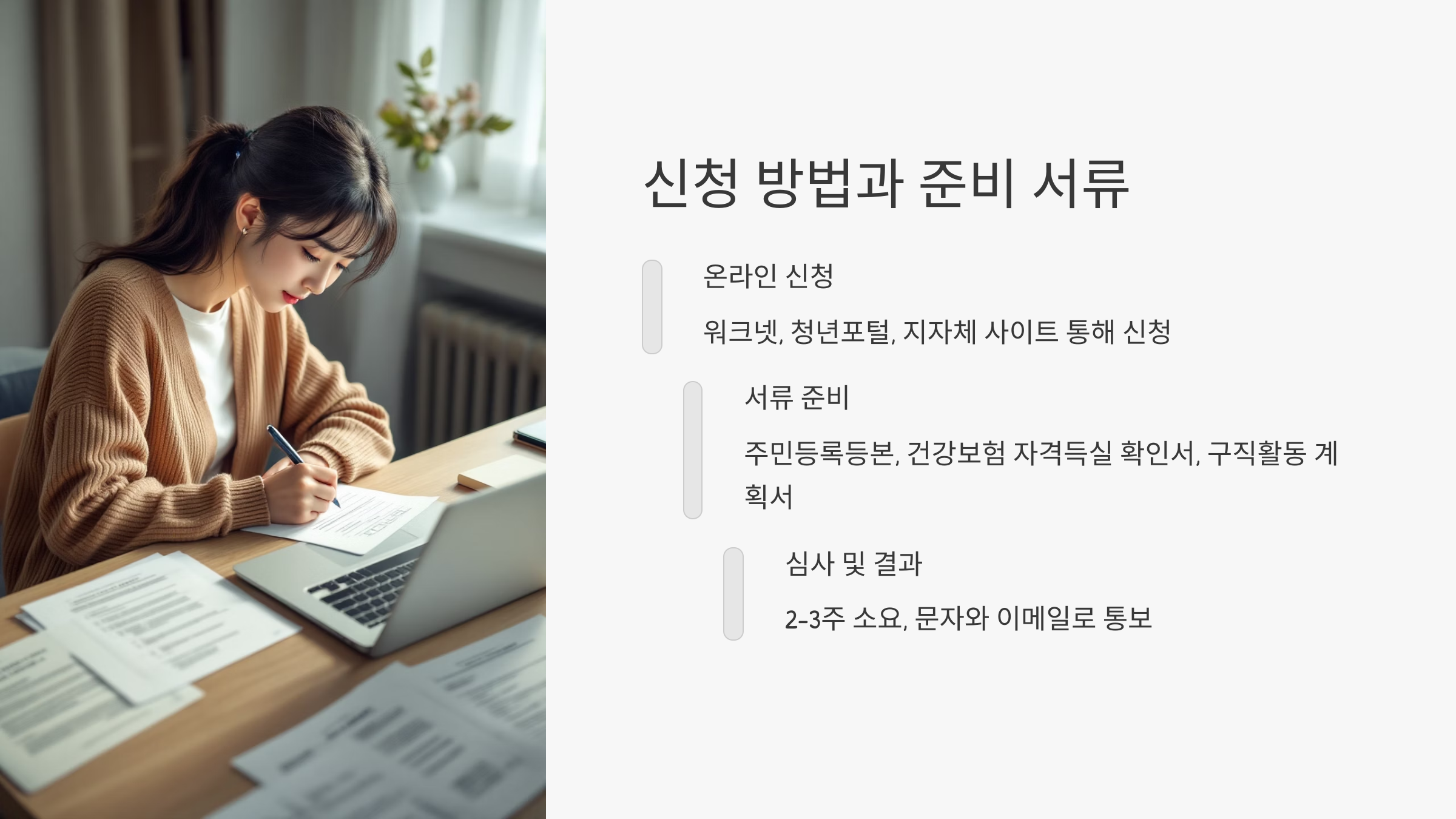 준비물로는 주민등록등본, 가족관계증명서, 건강보험 자격득실 확인서, 구직활동 계획서 등이 필요해요. 가구 소득 확인을 위한 건강보험 납부 내역도 중요하고요. 최근에는 모바일 앱으로도 증빙 서류 제출이 가능해서 훨씬 편리해졌답니다.