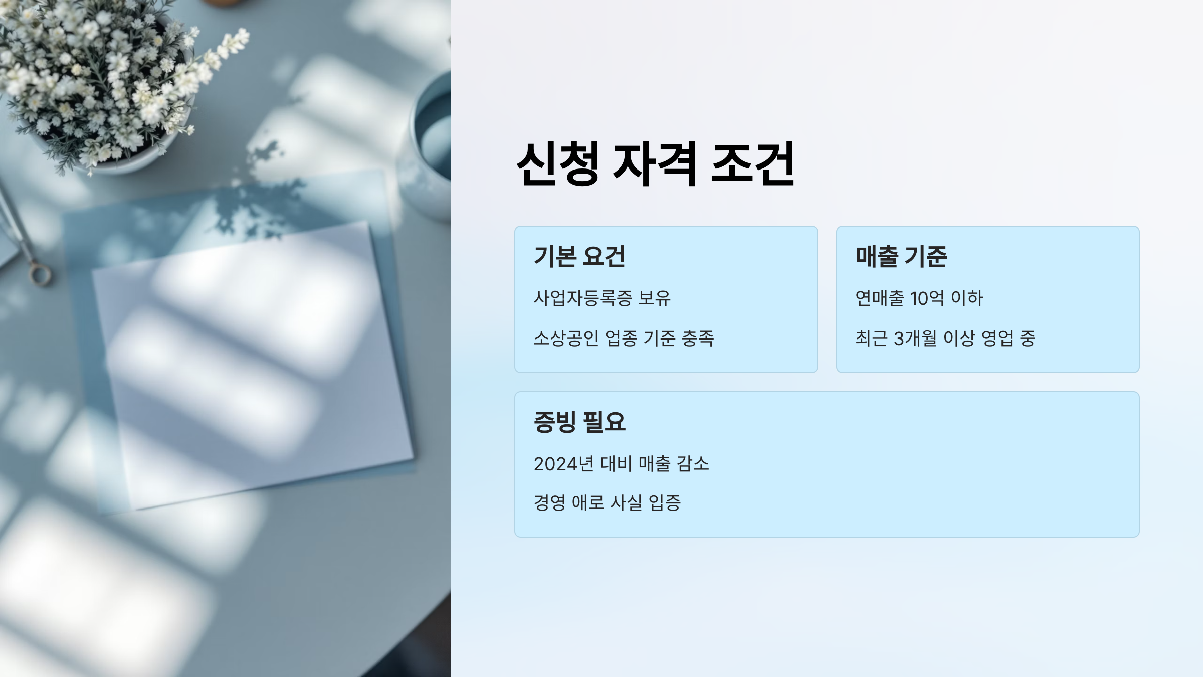 - 소상공인 업종 기준 충족 (제조, 도소매, 음식점 등)