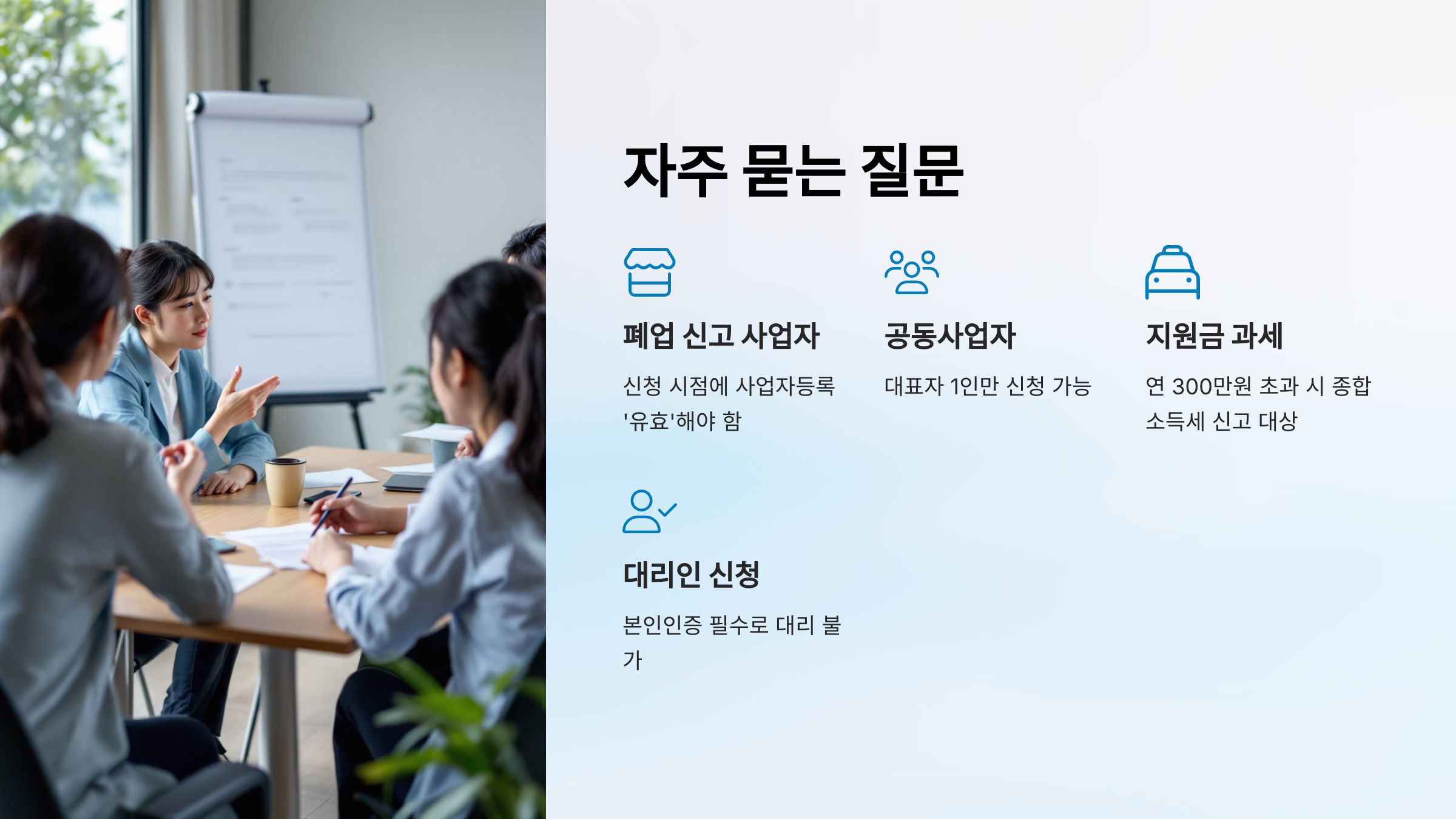 A1. 아니요. 신청 시점에 사업자등록이 ‘유효’해야 돼요.
