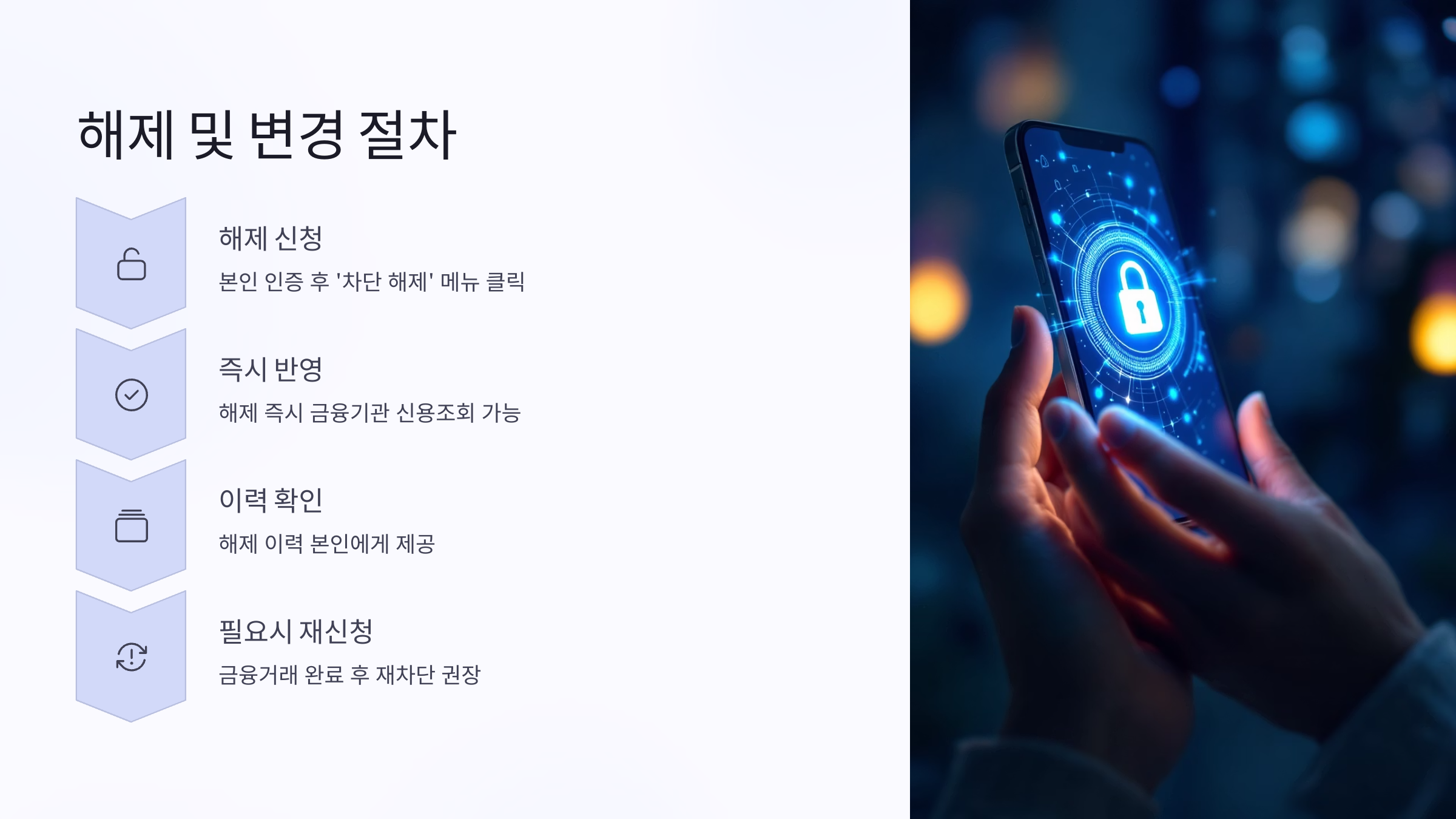 차단 해제는 즉시 반영되며, 이후에는 금융기관에서 정상적으로 신용조회 및 여신심사가 가능해져요. 단, 해제 후에는 다시 도용 위험이 생길 수 있으니 꼭 필요한 경우에만 해제하세요.