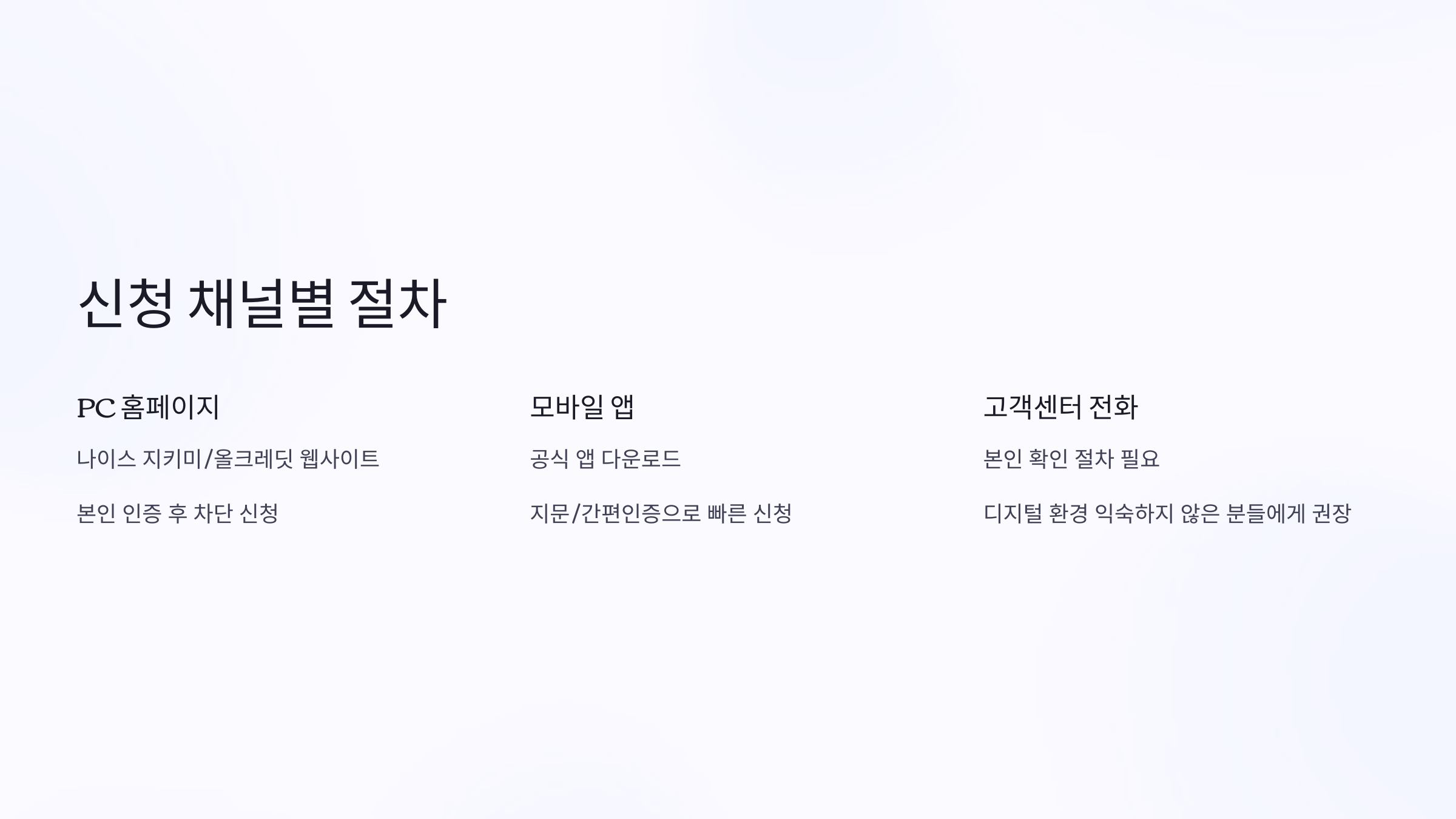 | KCB | 신용거래 차단 | 은행, 카드사, 캐피탈 | 온라인/모바일 | 본인 인증 |