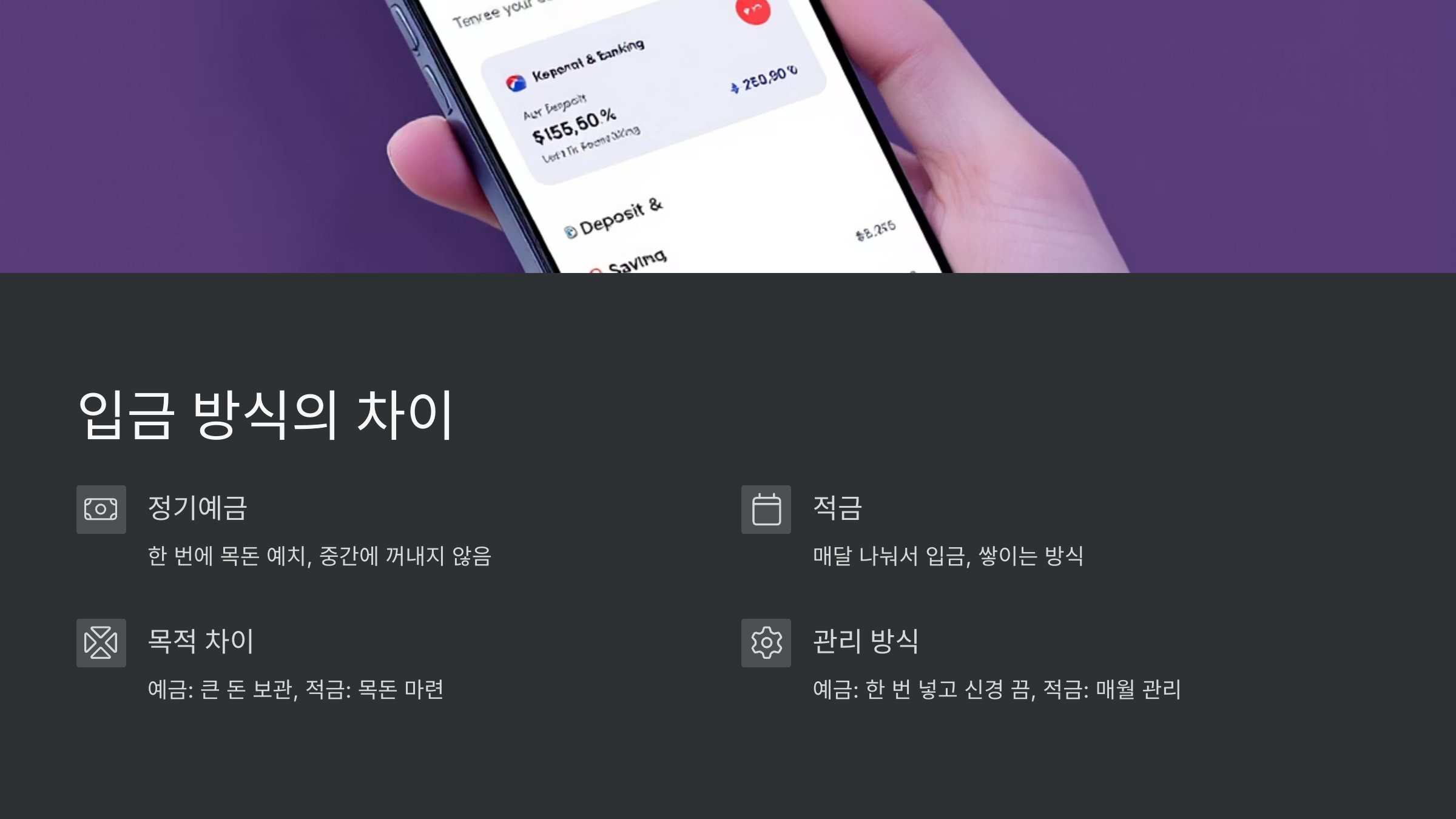 정기예금은 ‘큰 돈을 이미 가지고 있는 사람’에게 유리하고, 적금은 ‘매달 여유 자금을 모아가고 싶은 사람’에게 잘 맞아요. 입금 패턴의 차이가 곧 가입 목적의 차이로 이어지는 셈이죠.