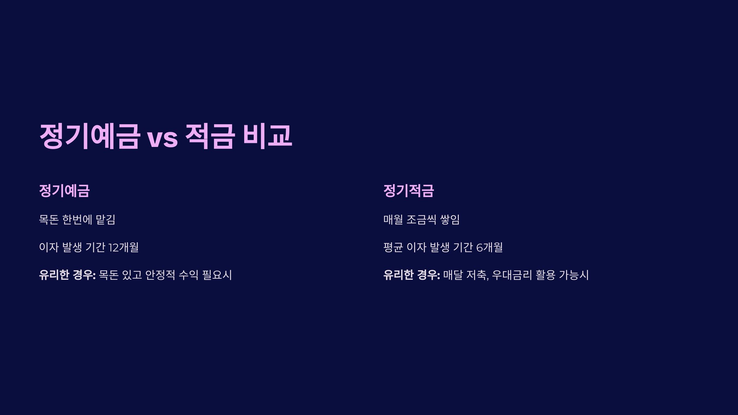 - 예금이 유리한 경우: 이미 목돈이 있고, 안정적 수익과 유동성이 필요한 경우