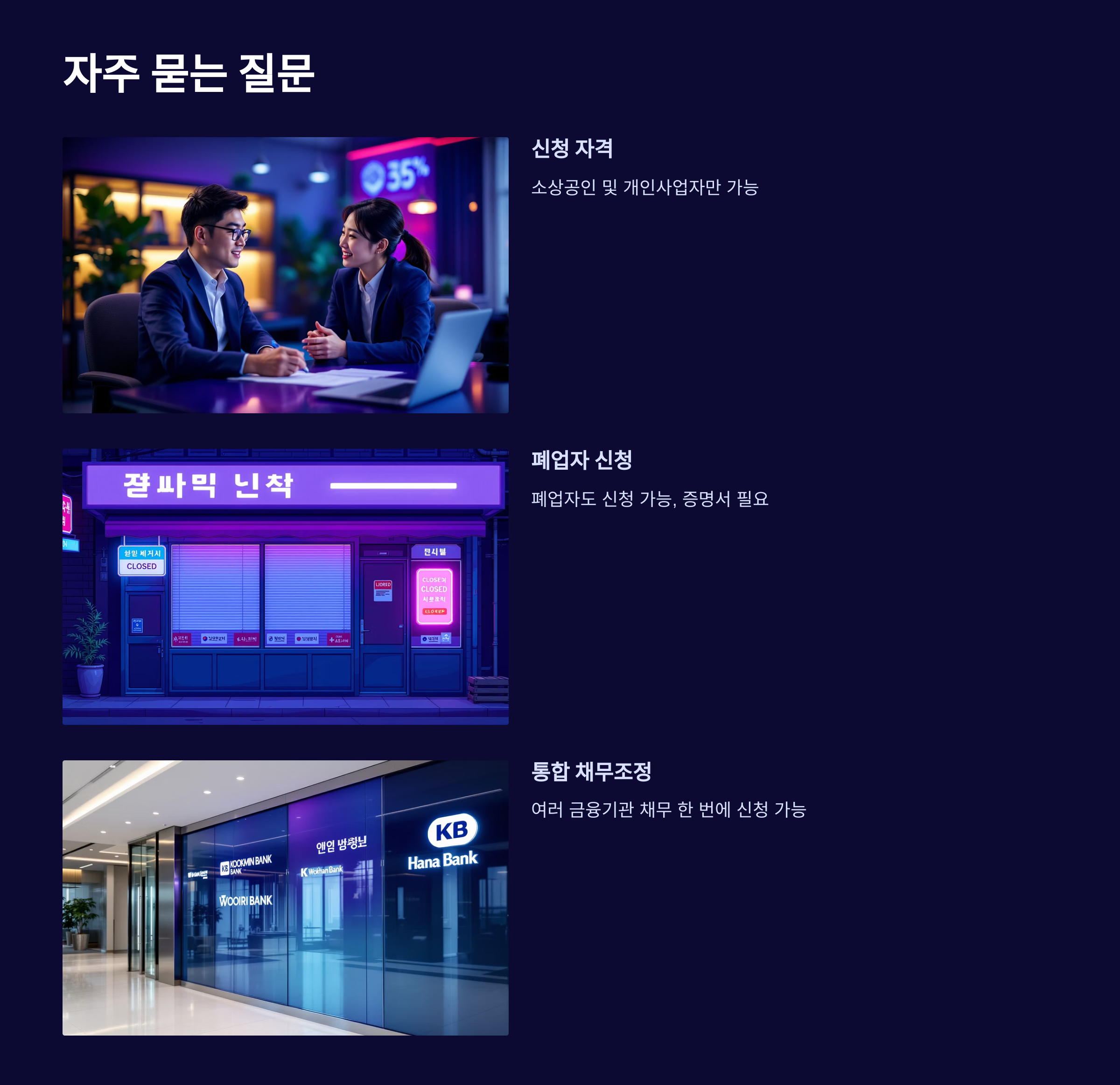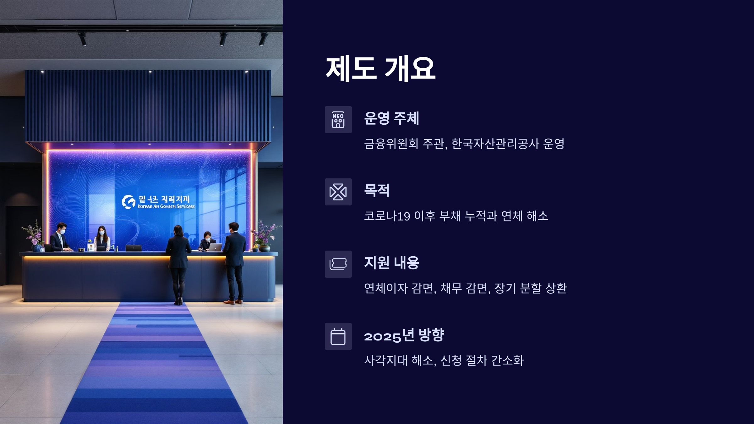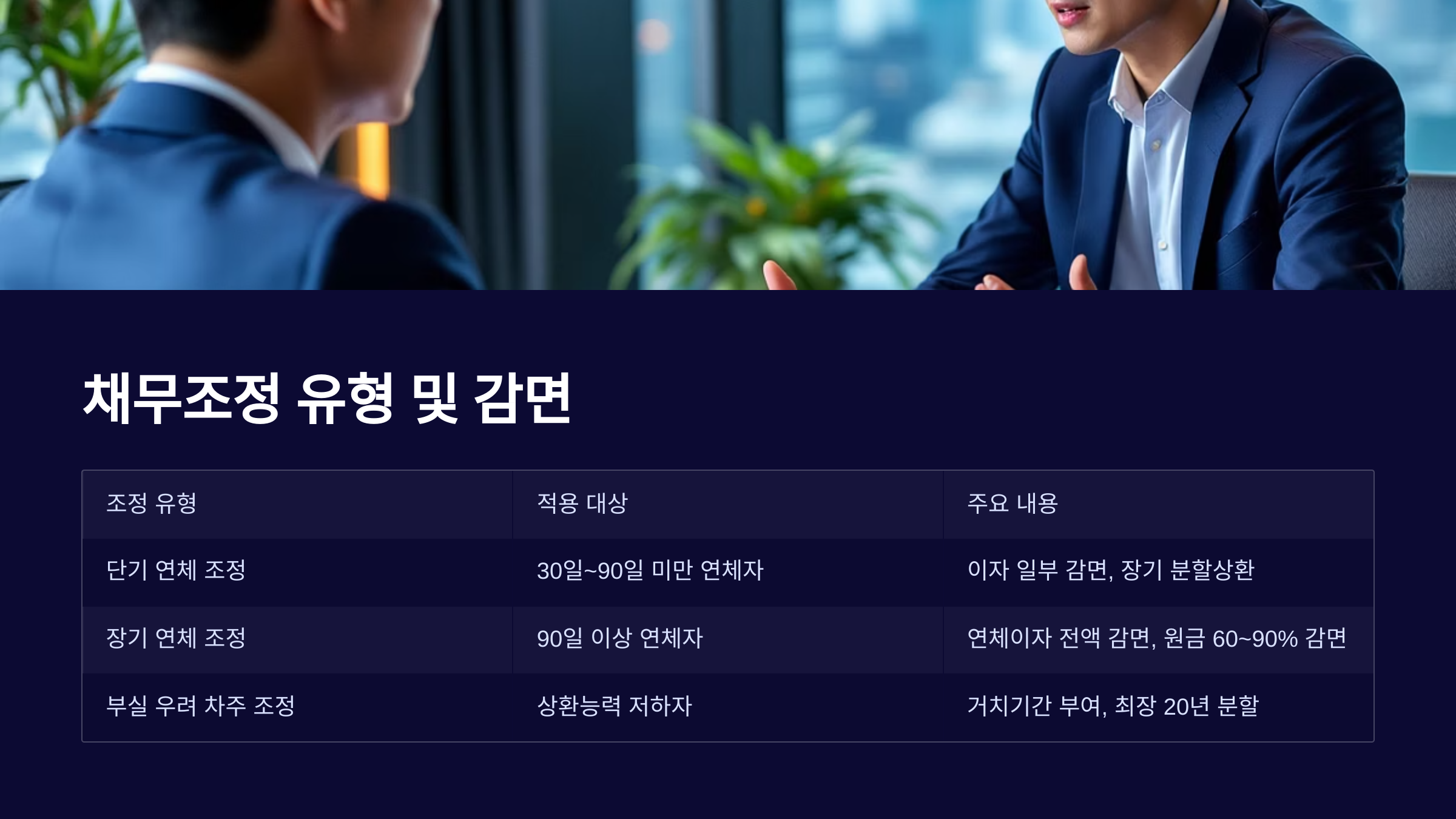 | 장기 연체 조정 | 90일 이상 연체자 | 연체이자 전액 감면 + 원금 60~90% 감면 가능 |