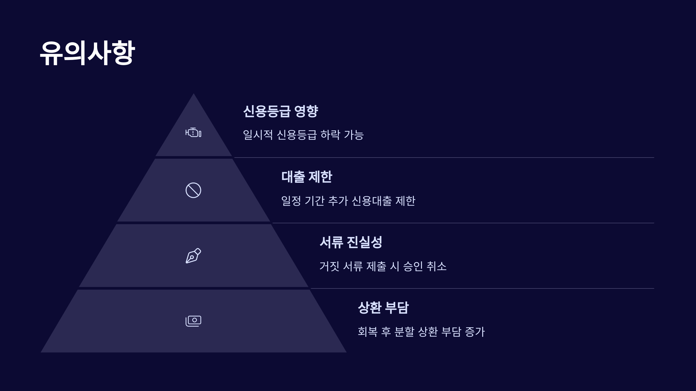 - 사업 정상화 이후에는 회복된 소득에 따라 분할 상환 부담이 커질 수 있어요.
