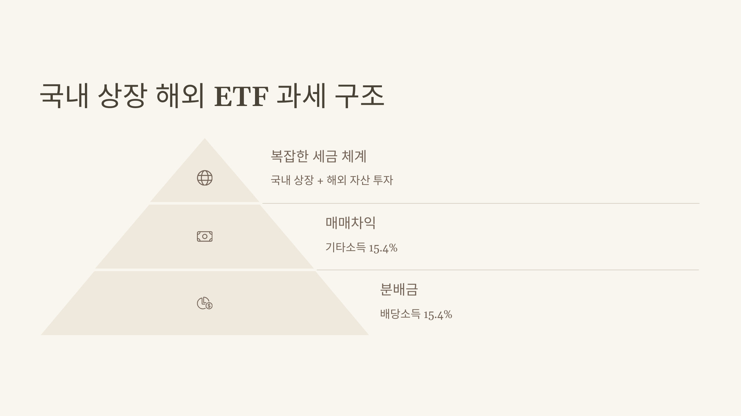 | 국내 상장 해외 ETF | 매매차익 + 분배금 | 기타소득 15.4% / 배당소득 15.4% |