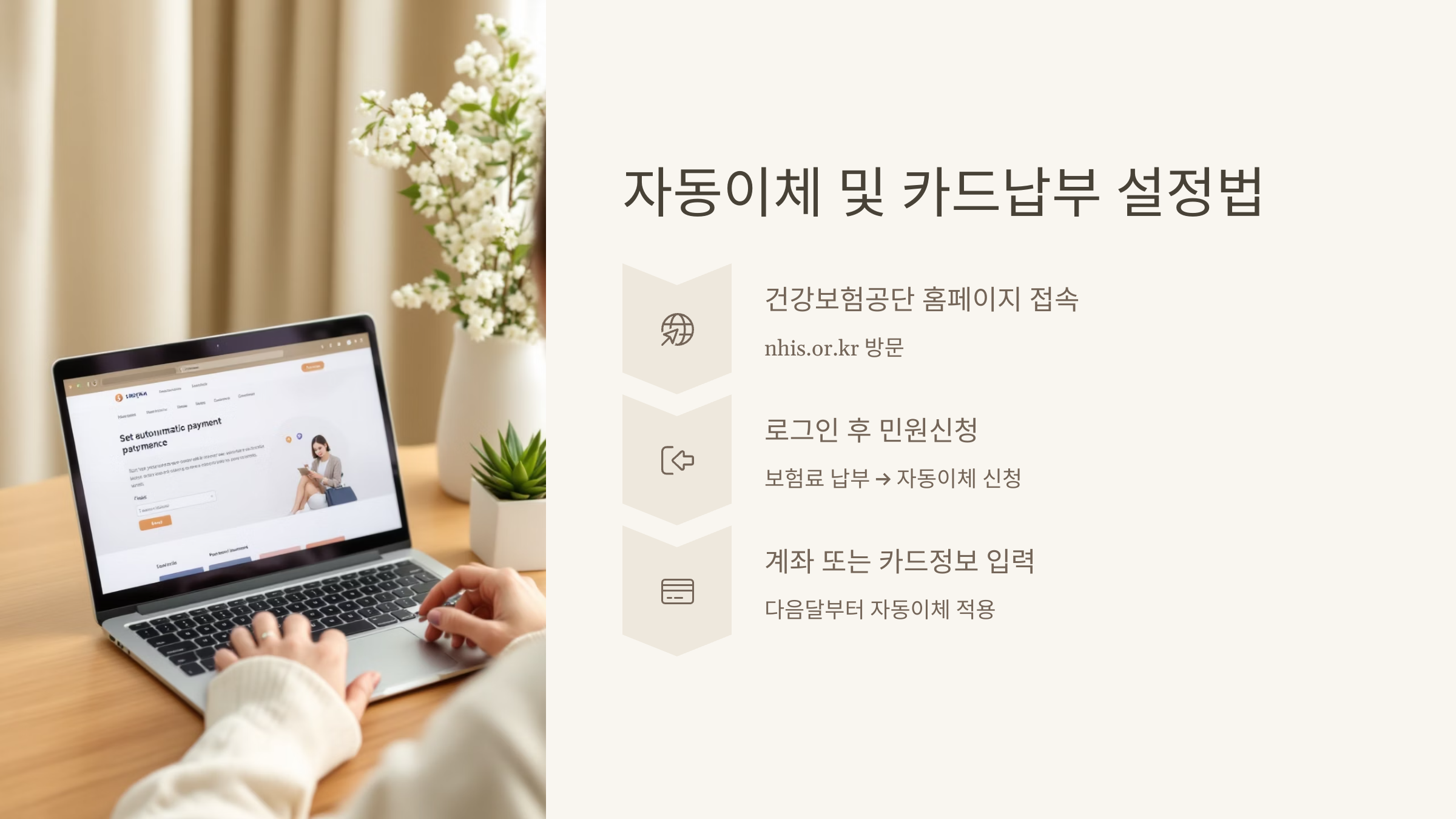 가장 많은 분들이 사용하는 건강보험료 납부방법은 자동이체예요. 매월 정해진 날짜에 은행 계좌나 카드에서 빠져나가니 연체 걱정도 없고 편리해요.