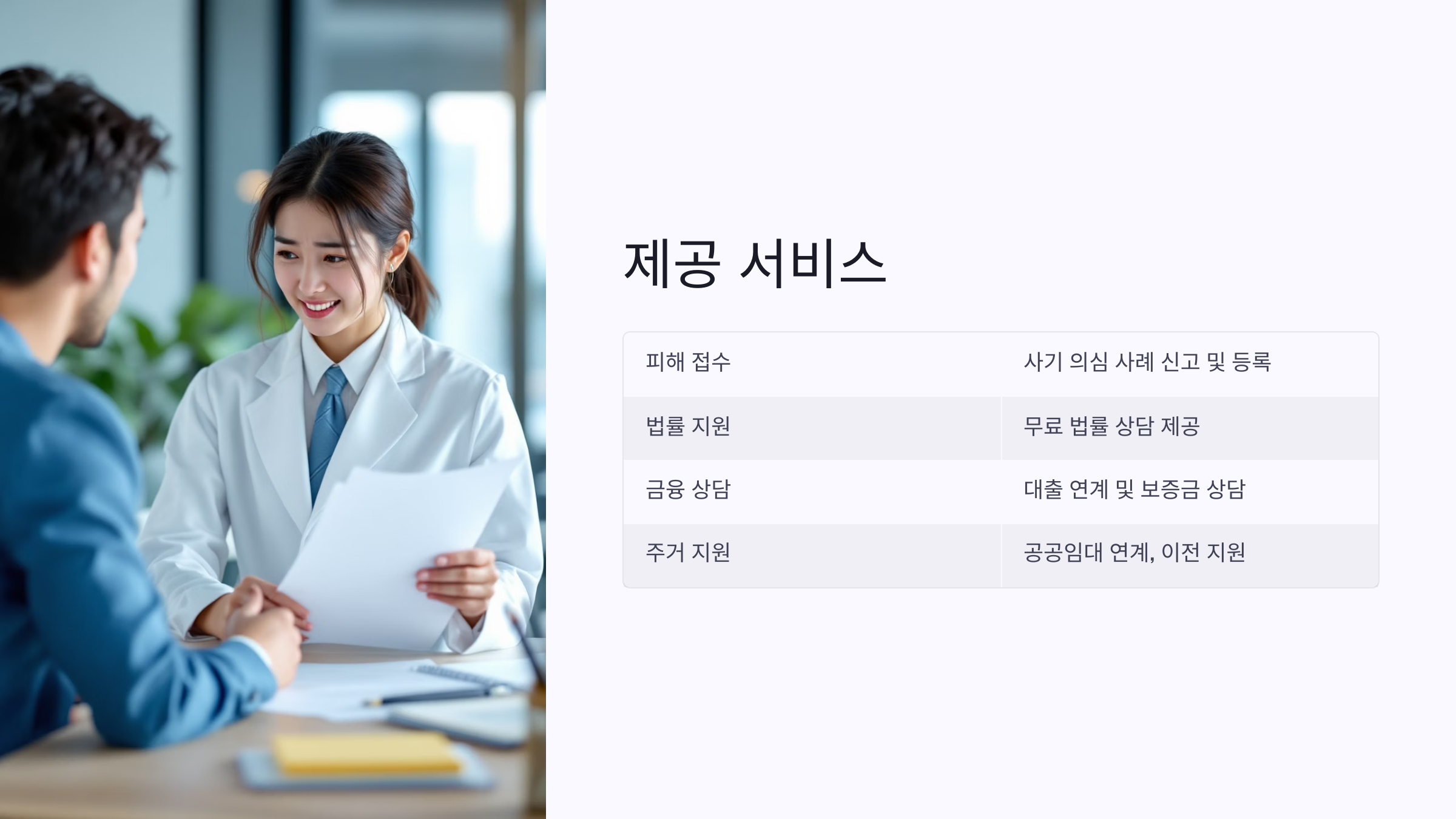센터는 단순한 상담 창구가 아니에요. 법률자문, 대출 상담, 주거 대책 등 ‘피해 이후 삶을 다시 세우는 데 필요한’ 모든 지원이 이곳에서 시작된다고 해도 과언이 아니에요.