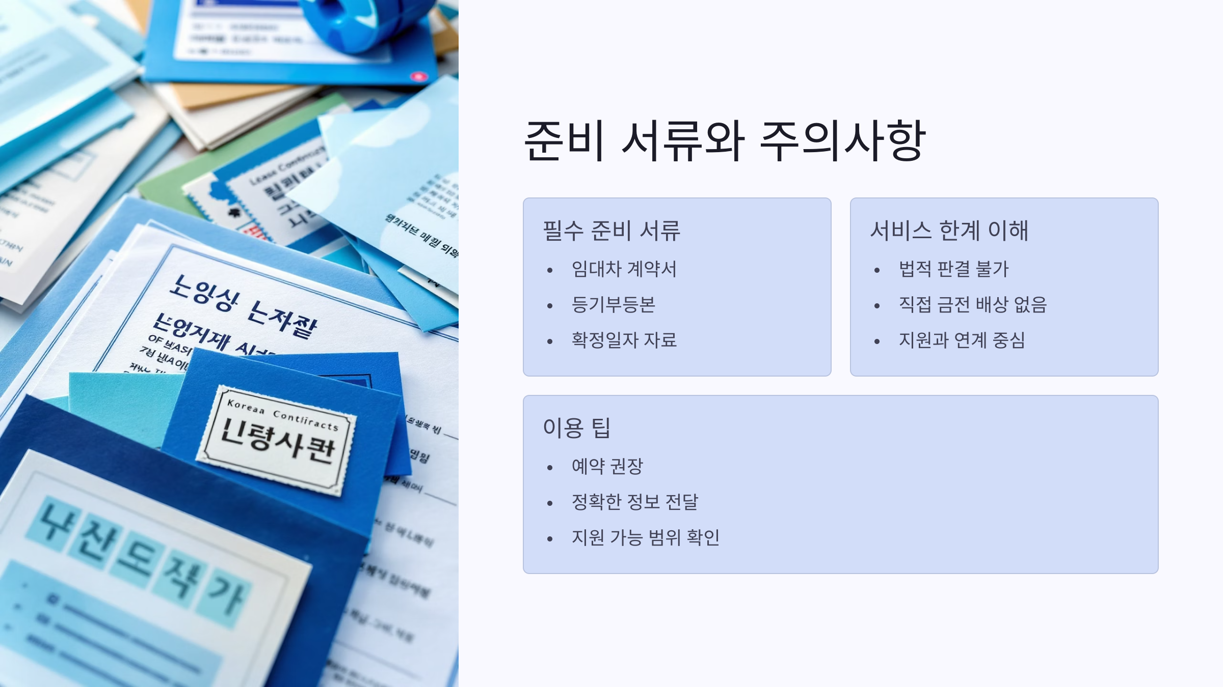 또한 서류를 정확히 갖춰야 상담이 원활하게 진행돼요. 계약서, 등기부등본, 확정일자 자료는 반드시 준비해 가세요!
