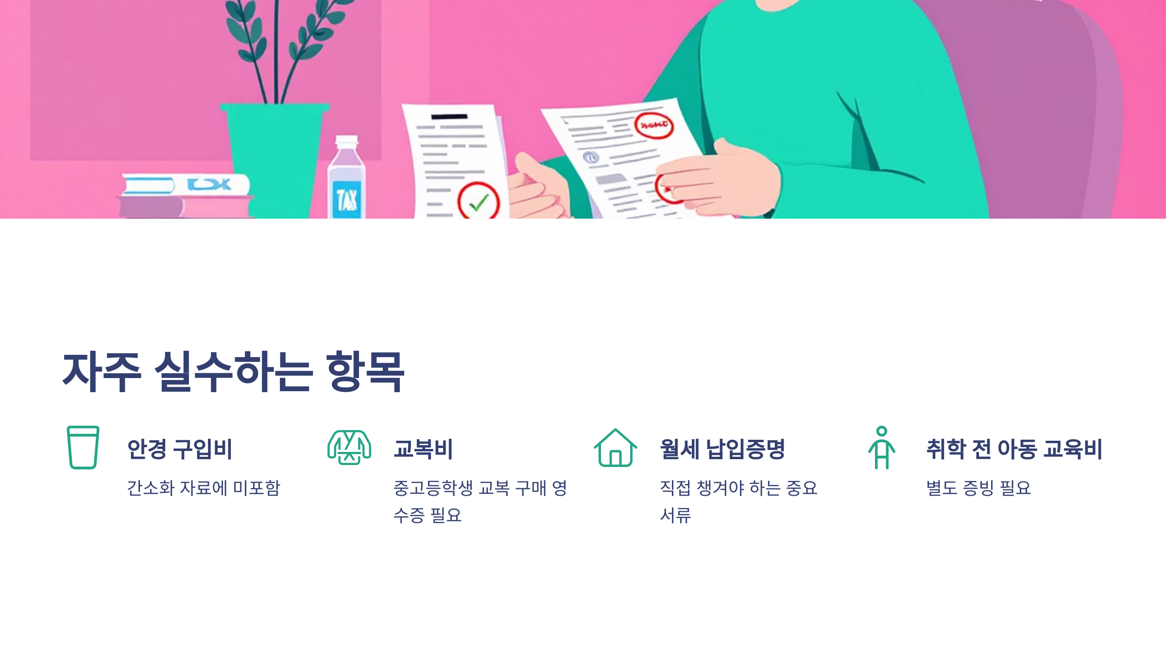 A2. 안경 구입비, 교복비, 월세 납입증명 등이 자동 등록되지 않아 직접 챙겨야 해요.