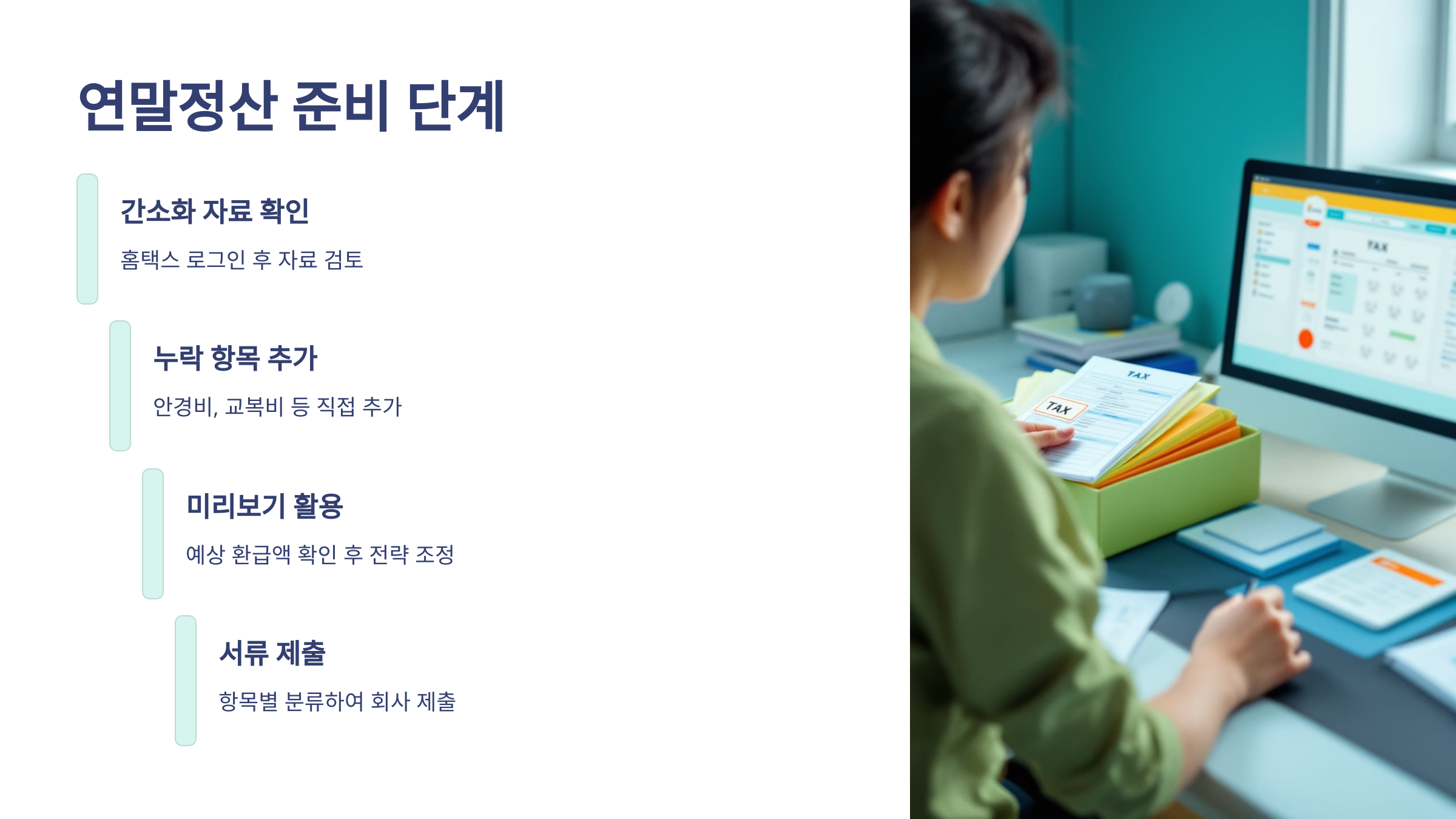 이제 연말정산을 잘 마무리하기 위한 실제 준비 단계를 알려드릴게요. 많은 분들이 연말정산 기간 동안 허둥지둥 서류만 제출하고 끝내지만, 제대로 준비하면 환급액이 훨씬 커질 수 있어요!