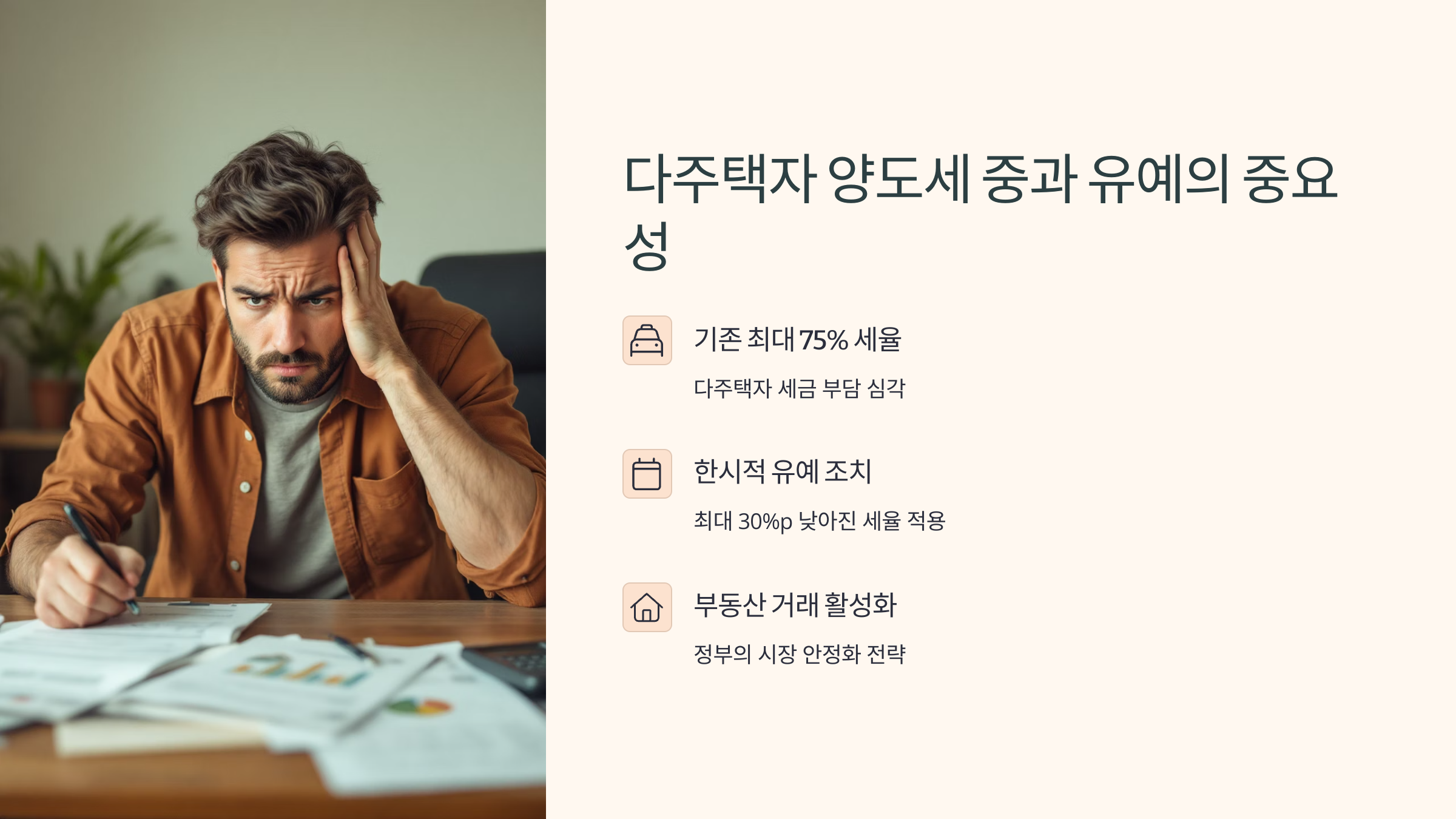 “지금 집을 팔아야 하나요?” 부동산 시장에서 가장 뜨거운 주제 중 하나가 바로 **다주택자 양도세 중과 유예**예요.