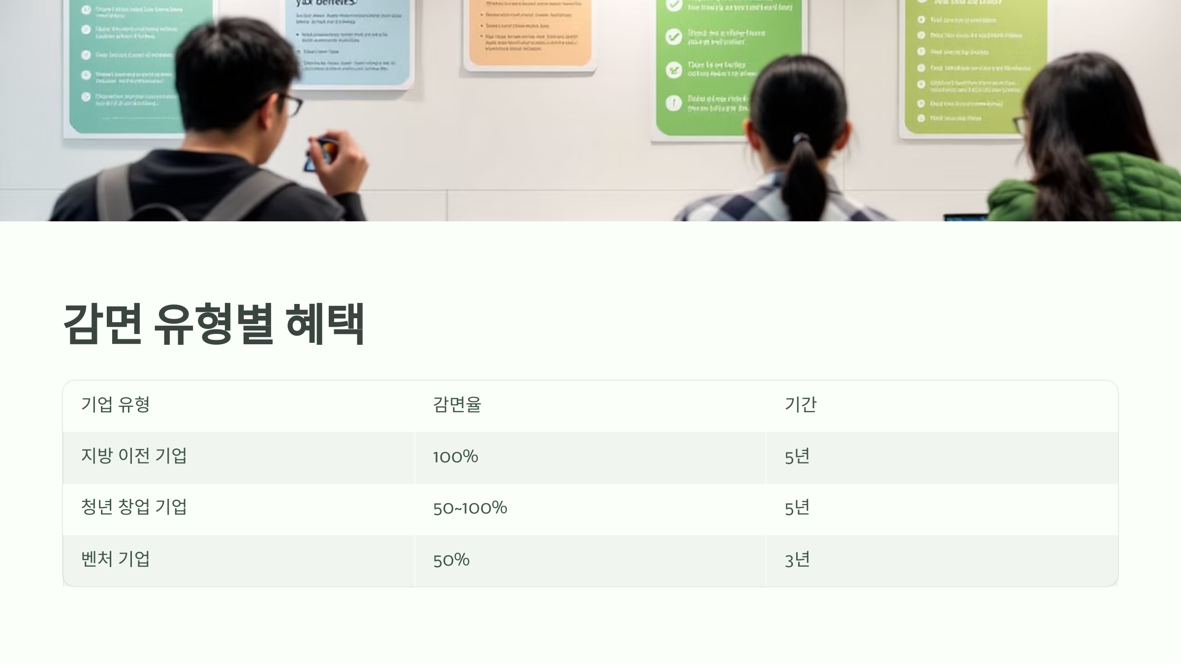 정부는 창업과 성장을 장려하기 위해 다양한 세제 혜택을 제공하고 있어요. 특히 지방 이전, 청년 창업 기업은 감면율이 더 높아요.