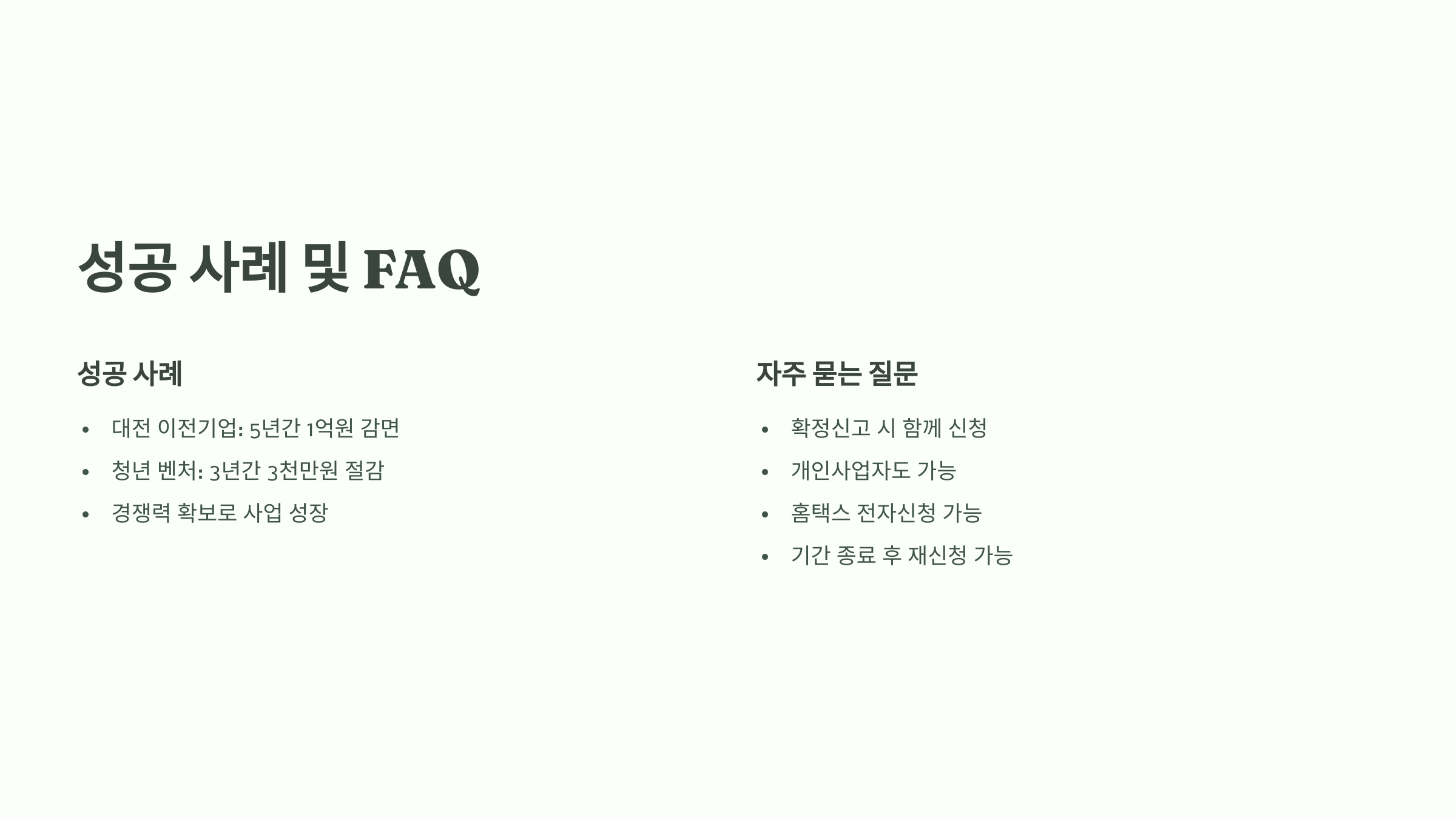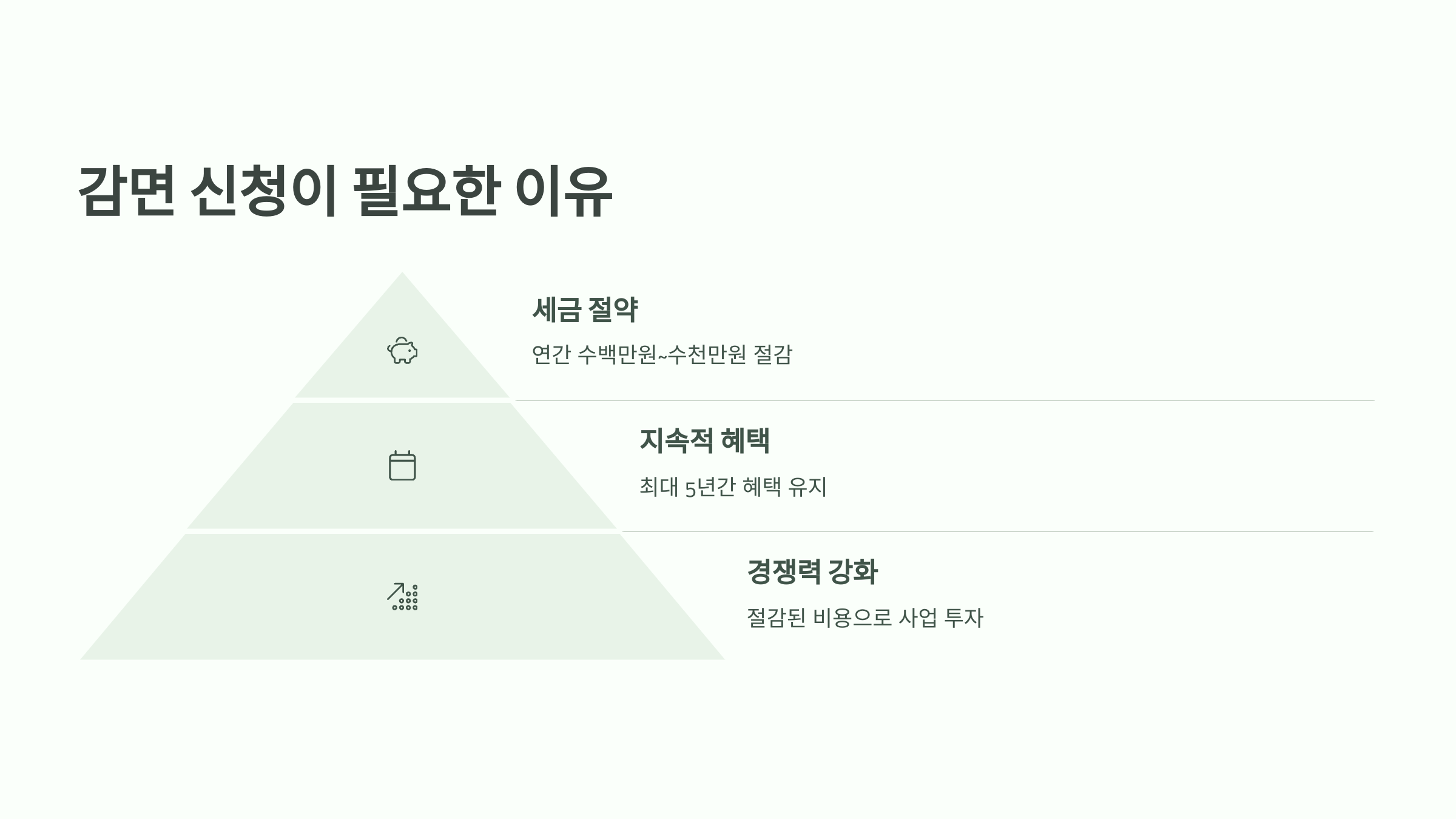 이처럼 감면 제도는 단순한 세제 혜택이 아니라 **경쟁력 확보 전략**이에요. 여러분도 바로 신청해볼 수 있어요!