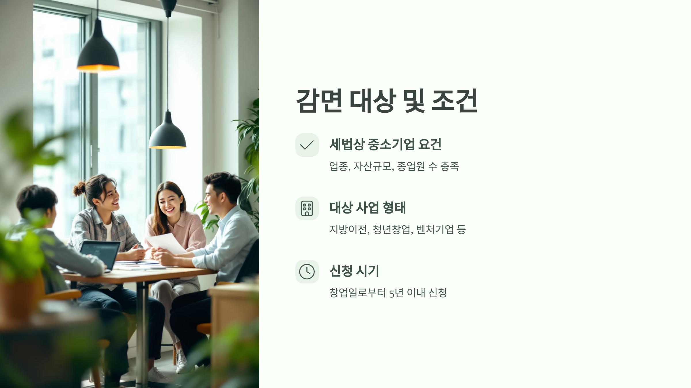 둘째, **감면 사유에 해당하는 사업 형태여야** 해요. 예를 들어 지방 이전 기업, 청년 창업 기업, 벤처기업 등이 해당돼요.