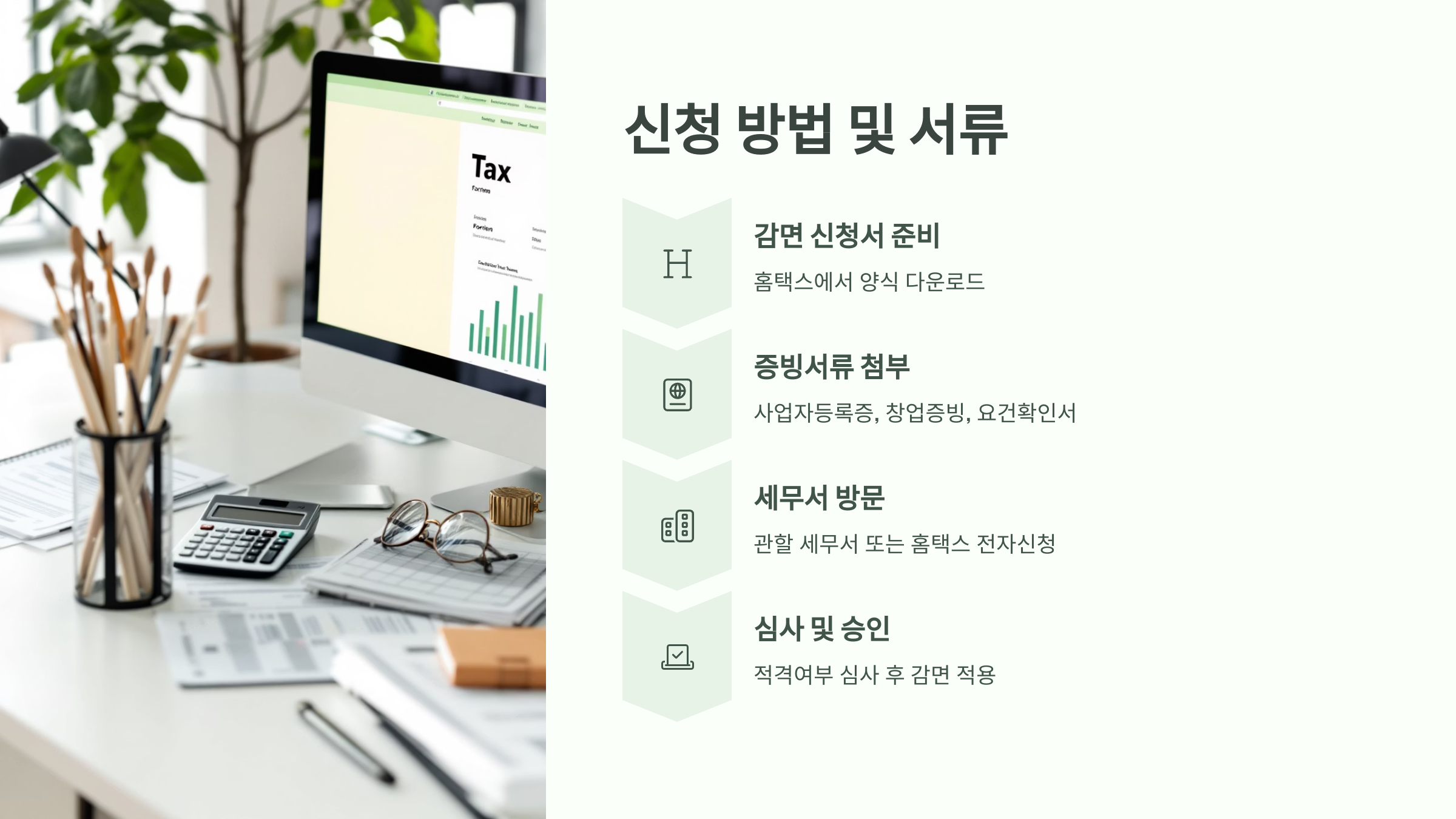 그리고 제출 서류로는 **감면 신청서, 사업자등록증 사본, 창업일 증빙자료, 요건 확인서** 등이 있어요. 경우에 따라 지방 이전 확인서나 벤처기업 확인서도 추가돼요.