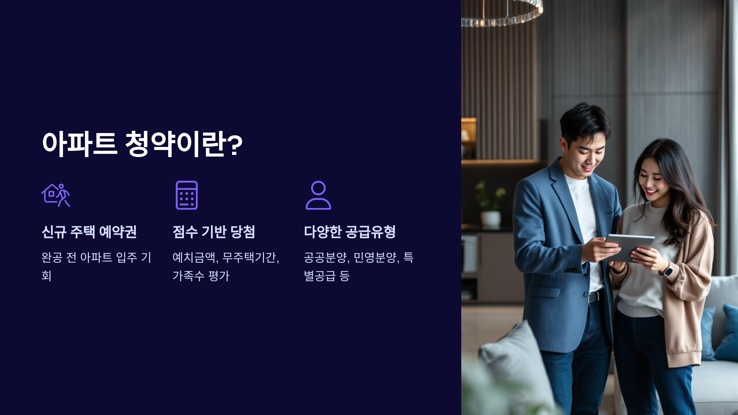 아파트 청약은 정부나 민간에서 건설하는 신규 주택에 대해 입주자를 사전에 모집하는 제도예요. 쉽게 말해 아직 완공되지 않은 아파트에 들어갈 수 있는 '예약권'을 신청하는 거죠. 예치된 금액, 무주택 여부, 부양가족 수 등 여러 조건을 바탕으로 당첨자를 선정해요.