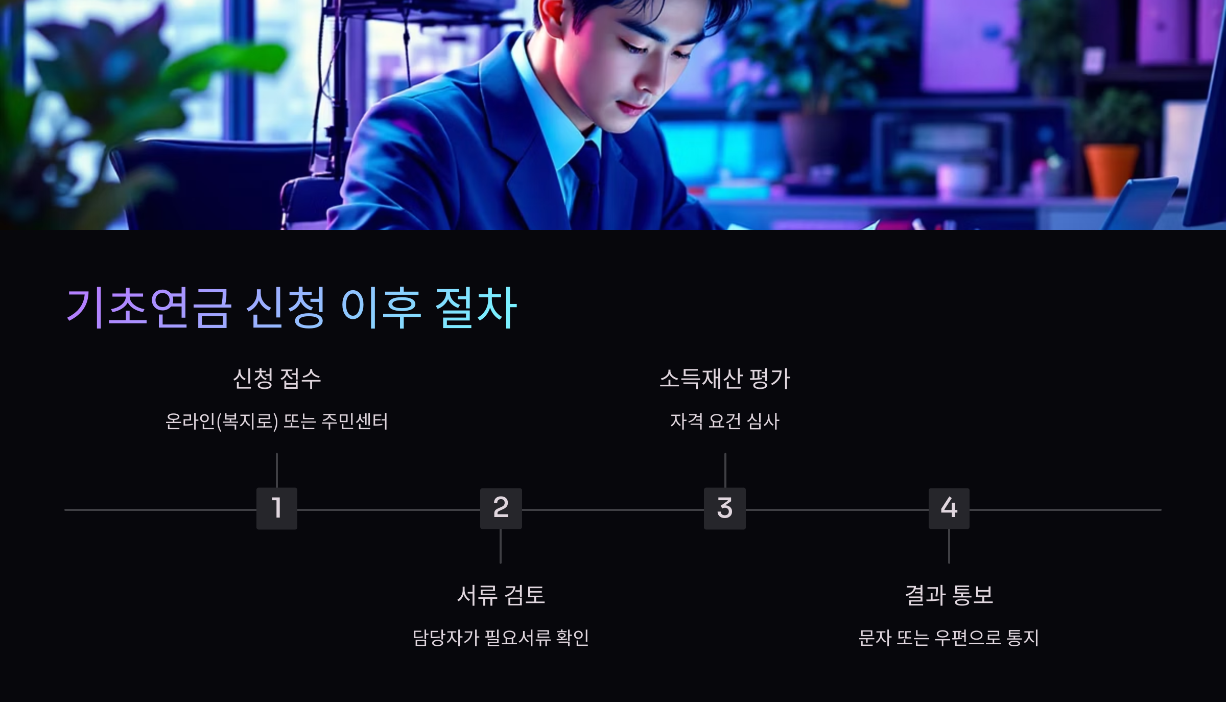 신청은 온라인(복지로)이나 읍면동 주민센터에서 가능하고, 이후 공무원 또는 국민연금공단 담당자가 필요서류 확인, 소득재산 평가를 진행해요.