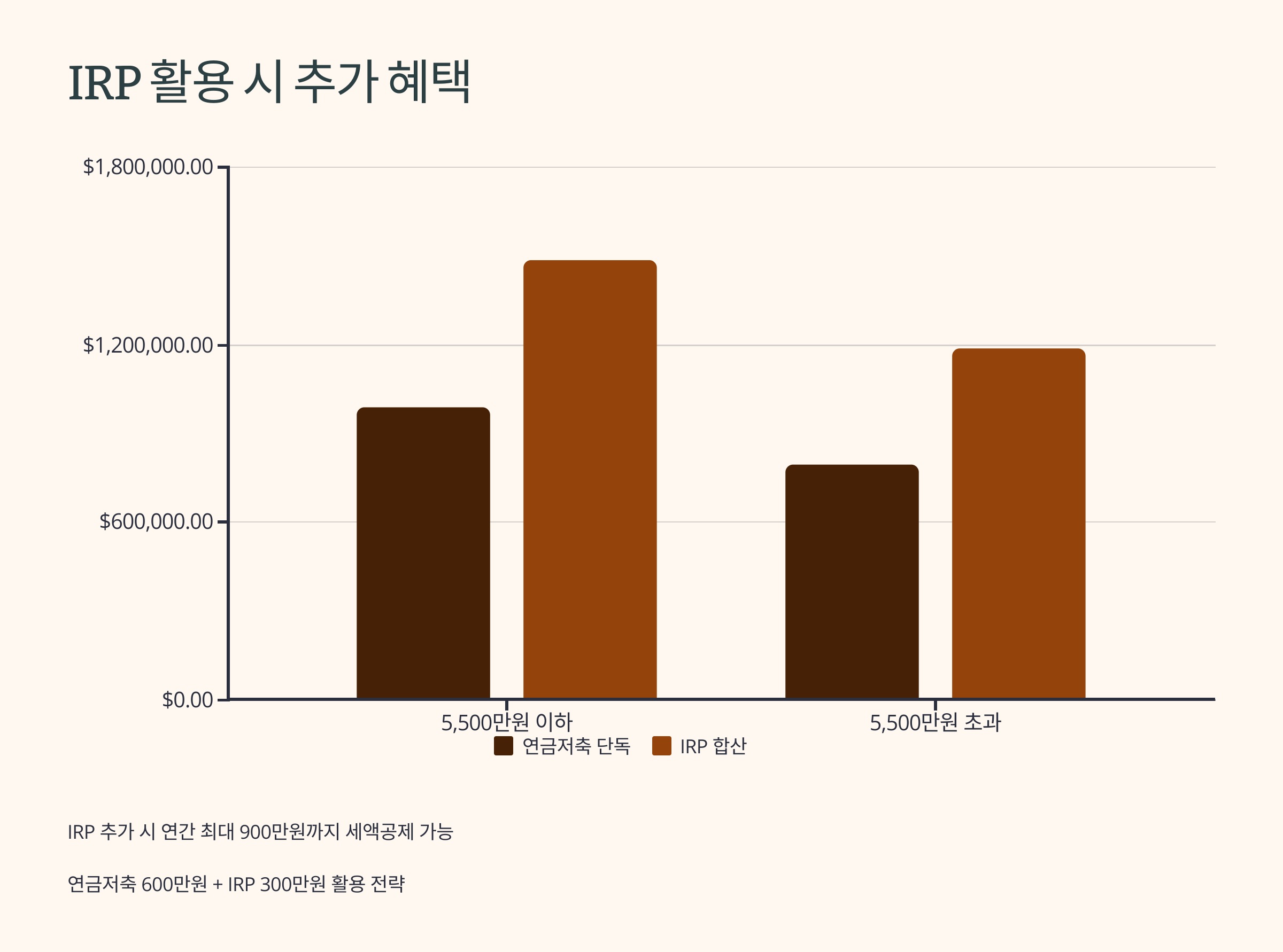 구분 연금저축 + IRP 합산 납입 한도 세액공제율 최대 공제 세액 총급여 5,500만 원 이하 연 900만 원 16.5% 148.5만 원 (종합소득금액 4,500만 원 이하) 총급여 5,500만 원 초과 연 900만 원 13.2% 118.8만 원 (종합소득금액 4,500만 원 초과) 즉, 연금저축펀드에 연 600만 원, IRP에 연 300만 원을 추가로 납입하여 총 900만 원을 채우면, 최대 148.5만 원(900만 원 × 16.5%)까지 세액공제를 받을 수 있습니다. 이는 기존 연금저축 단독 한도(최대 99만 원) 대비 상당한 추가 절세 효과입니다. (※ 과거 자료에서 언급된 115.5만 원은 IRP 합산 700만 원 한도 기준일 때의 수치이며, 2023년 이후 900만 원으로 상향 조정되었습니다.)