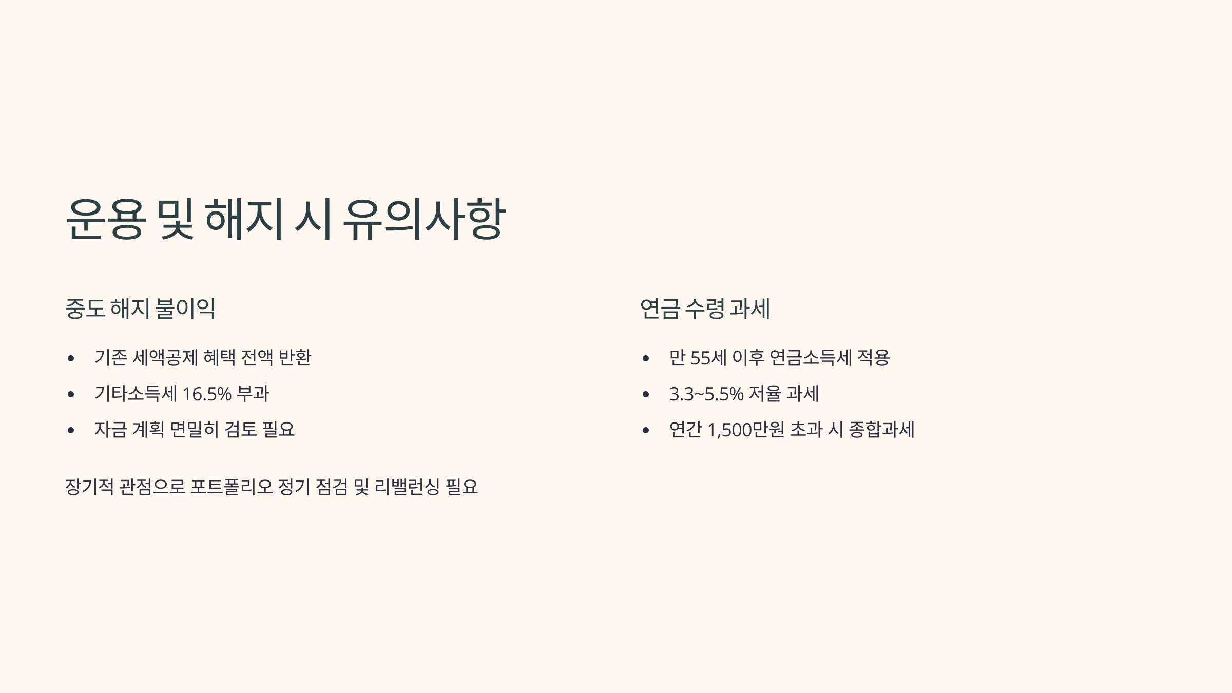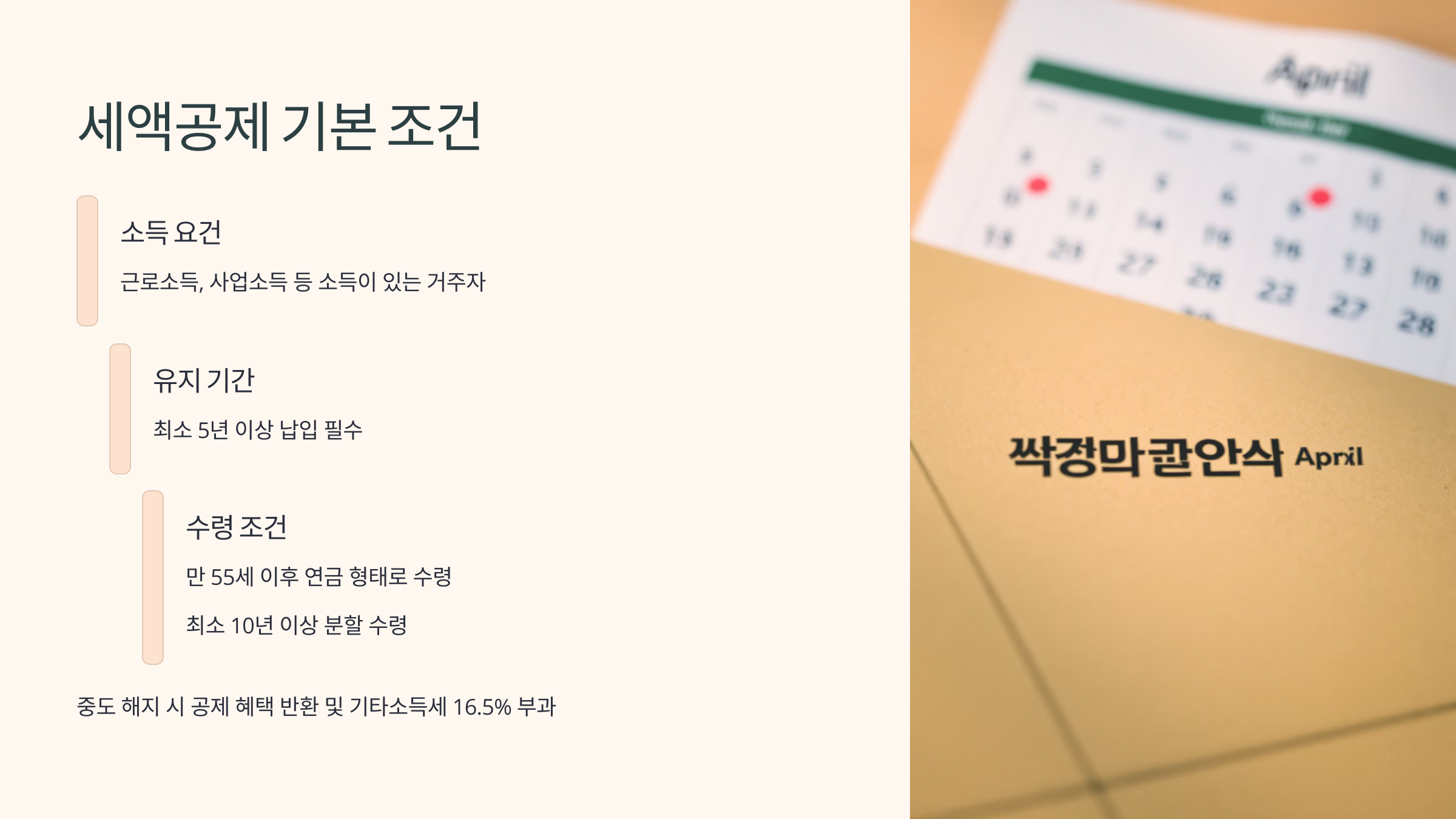 이 조건을 충족하지 못하고 중도 해지하거나 일시금으로 수령할 경우, 그동안 받은 세액공제 혜택을 반환해야 할 뿐만 아니라 기타소득세(16.5%)가 부과될 수 있으므로 유의해야 합니다.