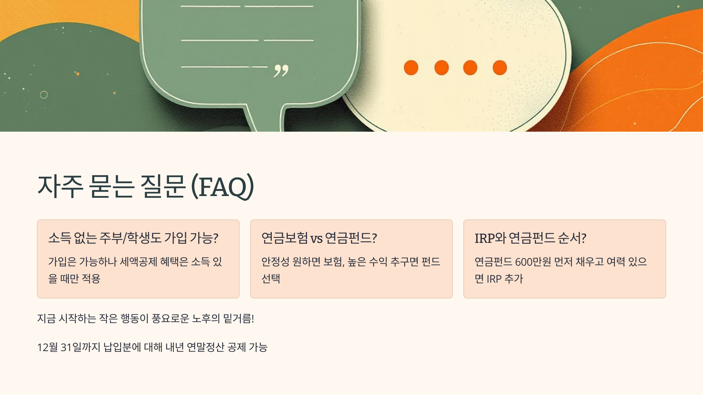 2025년에도 연금저축펀드는 강력한 세액공제 혜택을 제공하며, 현명한 재테크 수단이자 든든한 노후 대비책이 될 것입니다. 특히 연간 최대 900만 원 납입으로 최대 148.5만 원까지 절세할 수 있는 기회는 결코 작지 않습니다. 아직 연금저축펀드 가입을 망설이고 계신다면, 또는 이미 가입했지만 납입 한도를 채우지 못하고 계신다면, 올해가 가기 전에 적극적으로 활용하여 내년 연말정산에서 만족스러운 결과를 얻으시길 바랍니다. 지금 바로 시작하는 작은 행동이 풍요로운 미래를 만드는 밑거름이 될 것입니다!