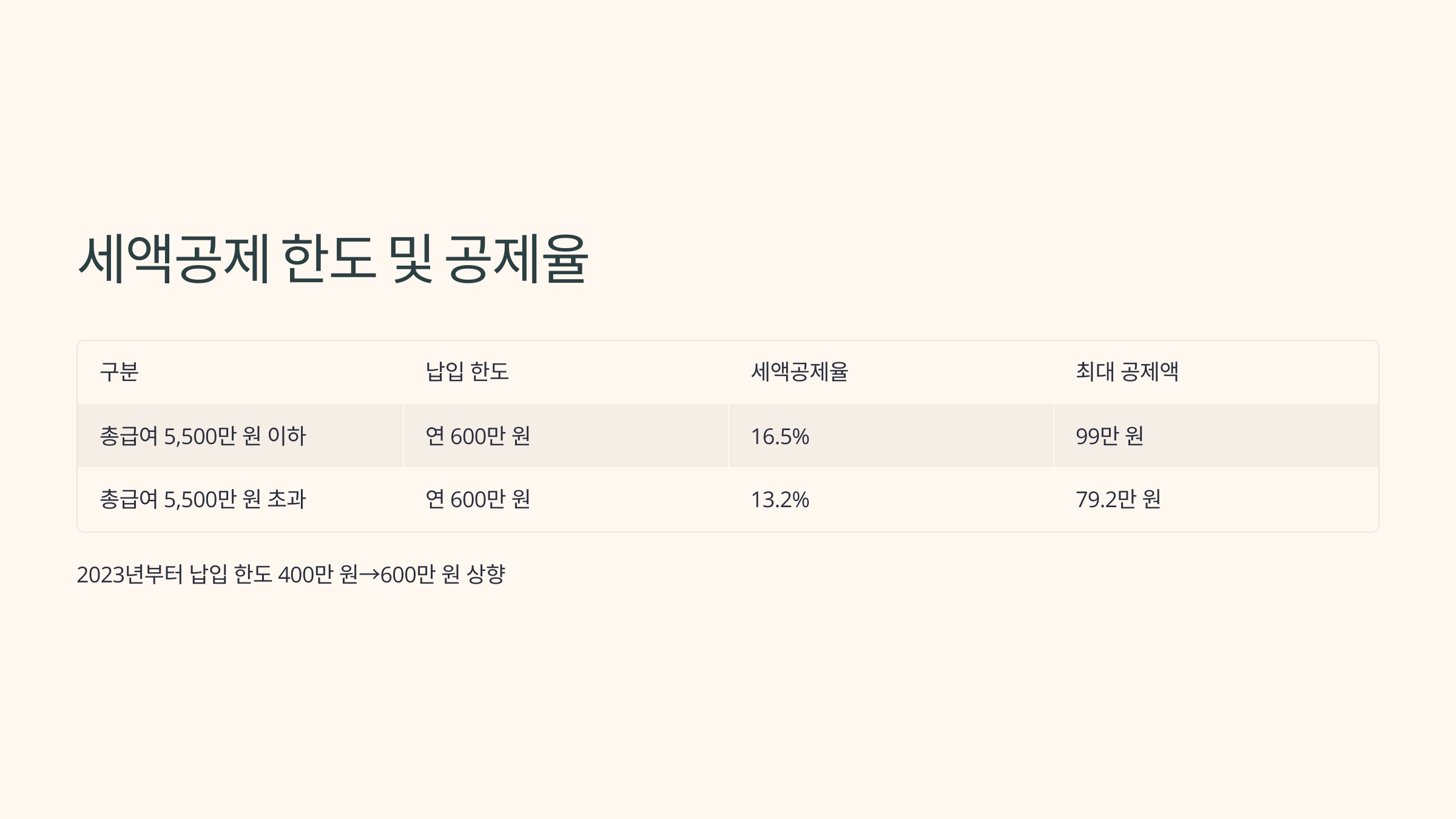 구분 연간 납입 한도 (세액공제 대상) 세액공제율 최대 공제 세액 총급여 5,500만 원 이하 연 600만 원 16.5% 99만 원 (종합소득금액 4,500만 원 이하) 총급여 5,500만 원 초과 연 600만 원 13.2% 79.2만 원 (종합소득금액 4,500만 원 초과)