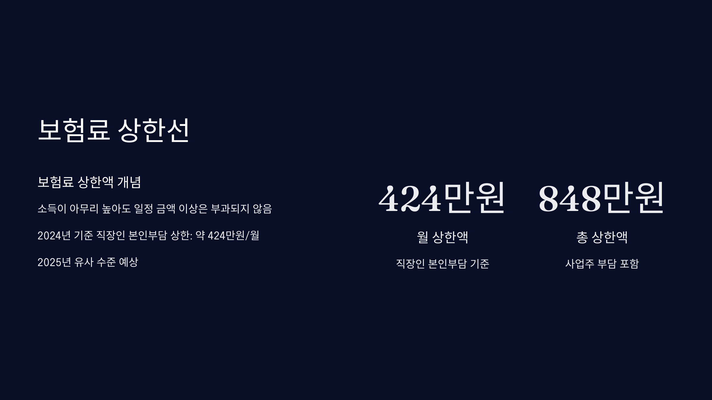 건강보험료에는 소득 수준에 따른 상한선과 하한선이 존재합니다. 2025년 기준으로 보수월액 보험료 상한액과 소득월액 보험료 상한액이 각각 정해져 있으며, 이를 초과하는 보험료는 부과되지 않습니다. 예를 들어 2024년 기준 직장가입자의 월별 건강보험료 상한액은 본인부담금 기준 약 424만원(총 848만원) 수준이었습니다. 2025년에도 유사한 수준에서 조정될 것으로 예상됩니다.