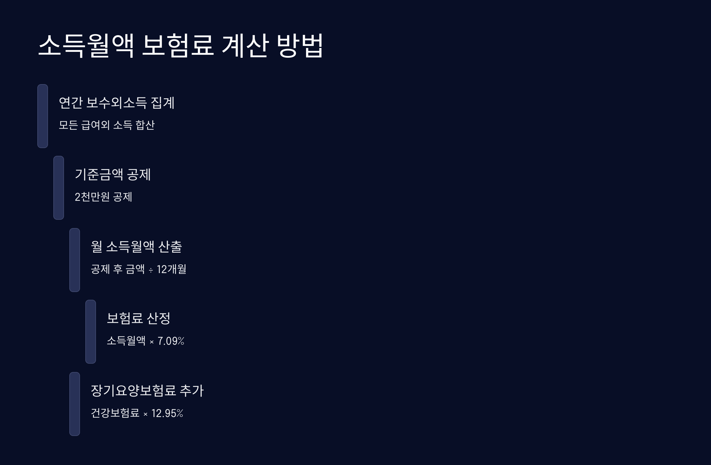 - 장기요양보험료 추가 : 산정된 소득월액 건강보험료에 장기요양보험료율(예: 건강보험료의 12.95%)을 곱하여 추가합니다.