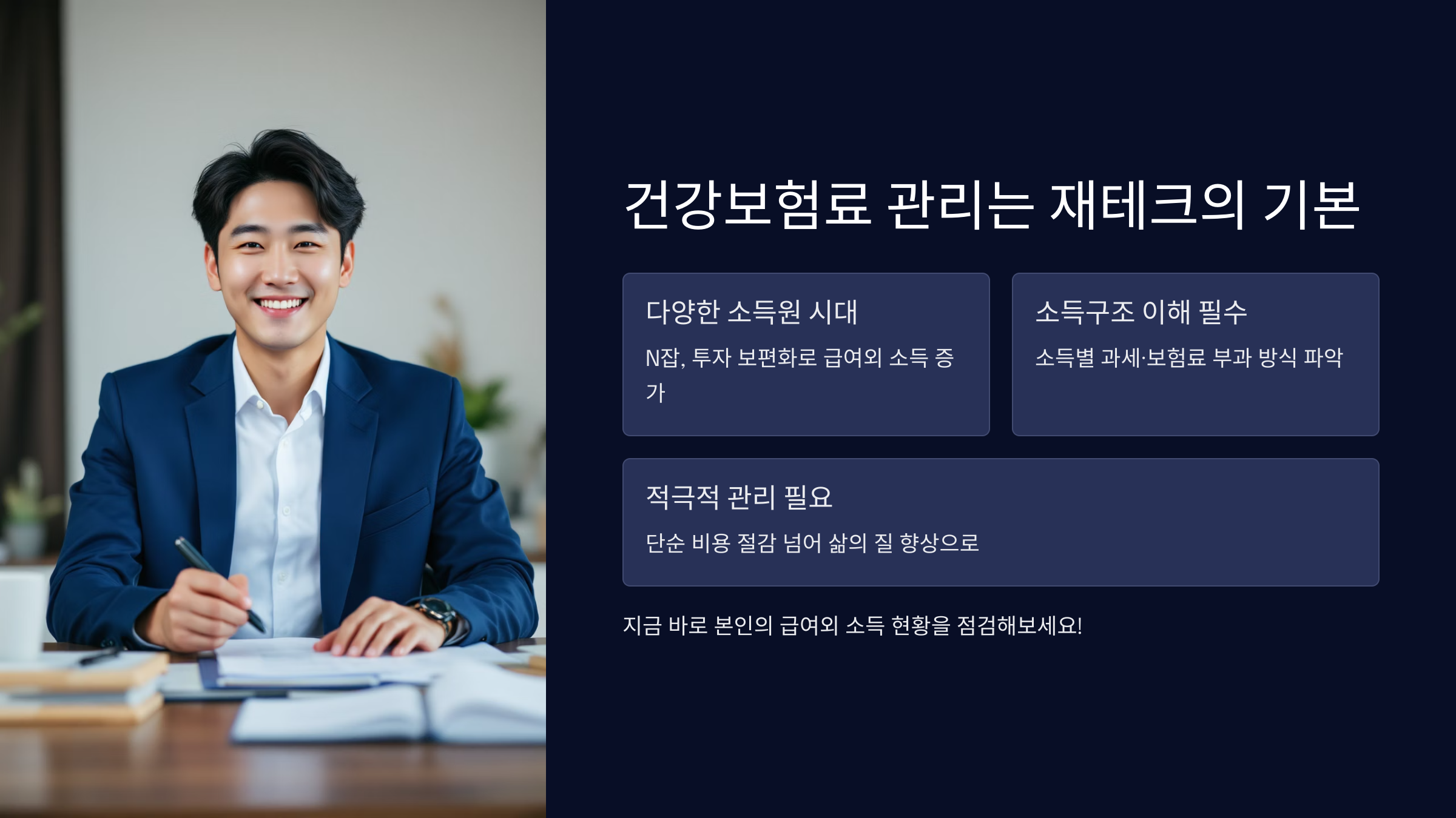 가장 주목해야 할 부분은 직장가입자의 급여외 소득이 연간 2천만원(2022년 9월부터 시행된 기준, 이전 3,400만원에서 하향 조정)을 초과하는 경우, 초과분에 대해 추가로 '소득월액 보험료'가 부과된다는 점입니다. 이는 단순히 월급에만 건강보험료가 부과되던 시대가 지나갔음을 의미합니다!