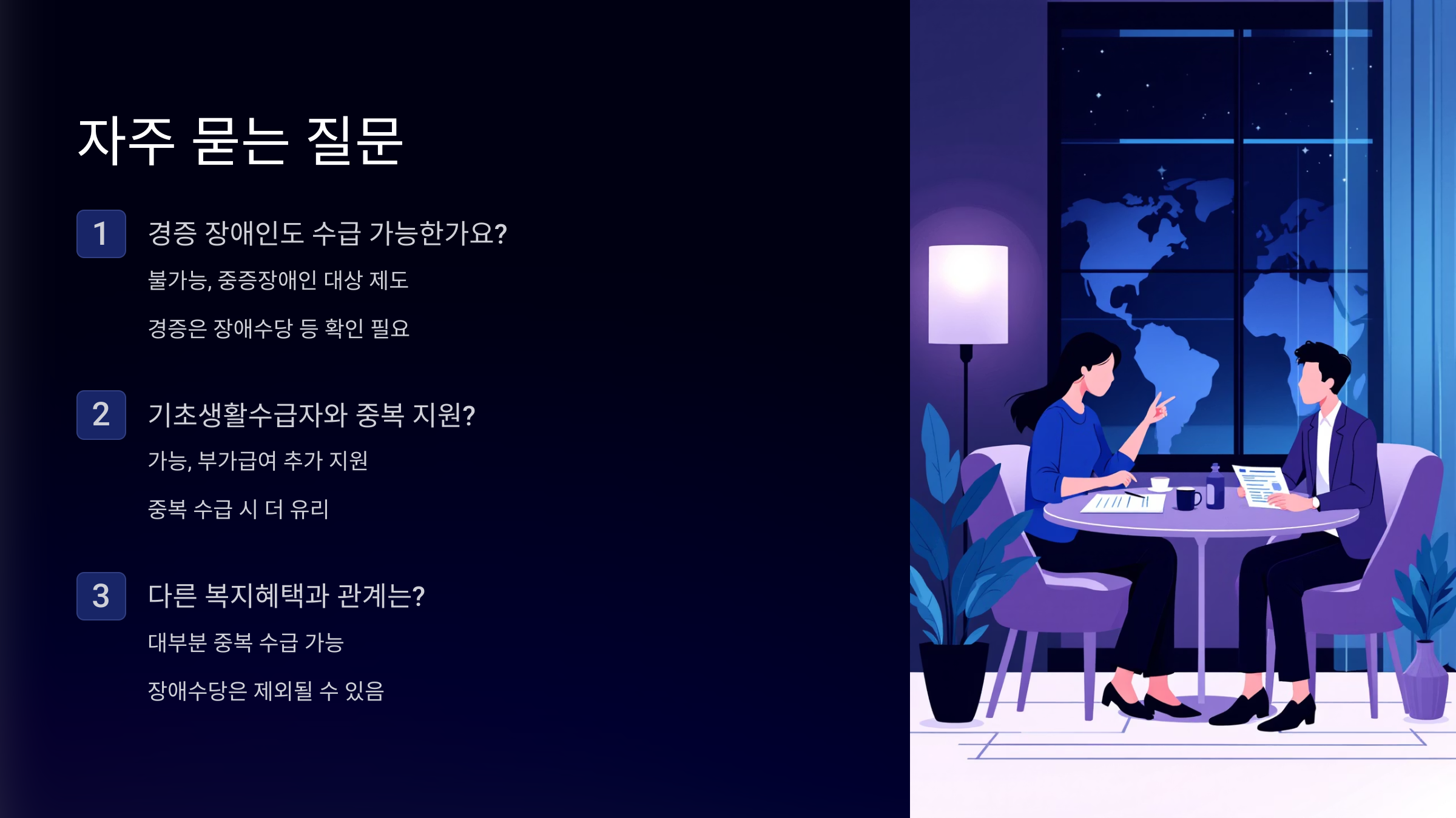 A: 장애인연금은 기초생활보장제도의 생계급여나 주거급여, 장애인활동지원 서비스 등과 중복 수급이 가능 합니다. 다만, 장애수당의 경우 장애인연금 수급자는 지급 대상에서 제외되는 등 일부 중복이 제한될 수 있습니다. 또한, 장애인연금 수령액이 다른 복지급여의 소득 산정 시 포함될 수 있으므로, 종합적인 상담을 통해 본인에게 가장 유리한 복지 설계를 하는 것이 중요합니다.