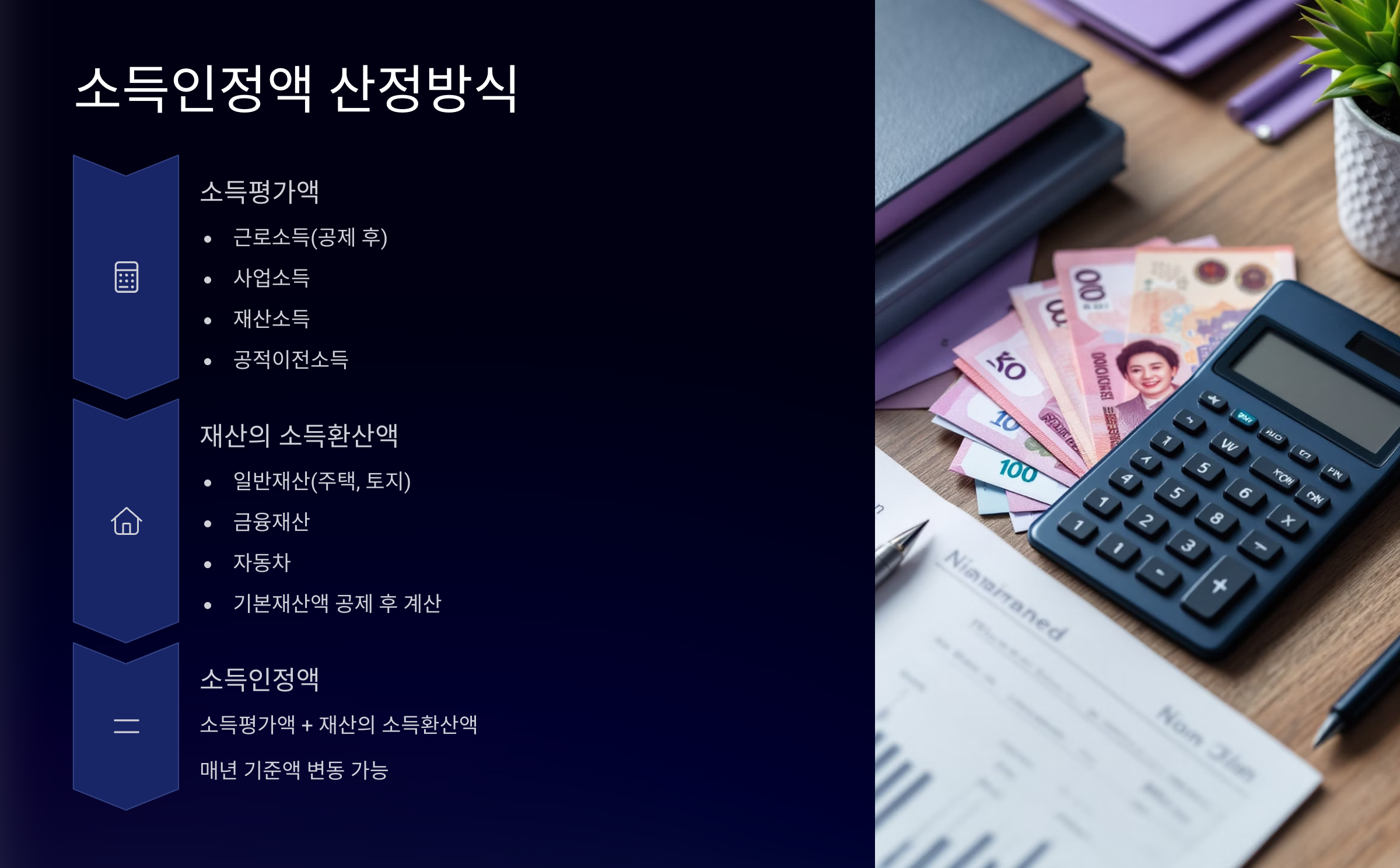 소득인정액 산정 방식 : 소득인정액 = 소득평가액 + 재산의 소득환산액 * 소득평가액 : 근로소득(공제 후), 사업소득, 재산소득, 공적이전소득(국민연금 등) 등을 합산한 금액입니다. * 재산의 소득환산액 : 일반재산(주택, 토지 등), 금융재산, 자동차 등의 가액에서 기본재산액을 공제한 후 소득환산율을 곱하여 산정됩니다.
