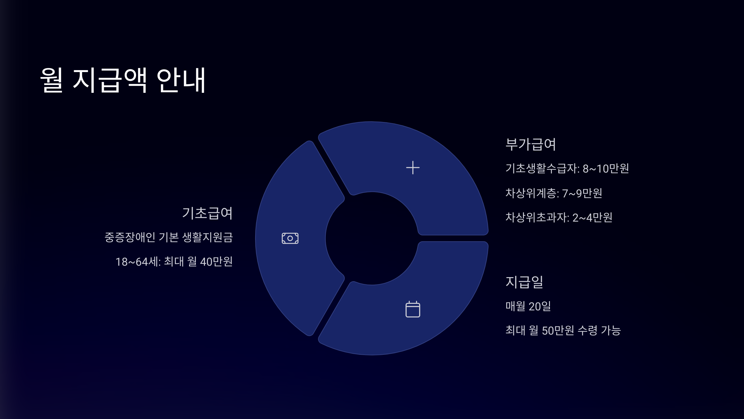장애인연금은 크게 기초급여와 부가급여로 구성되며, 수급자의 소득 수준 및 연령 등에 따라 차등 지급됩니다. 2025년 기준으로 예상되는 월 지급액은 다음과 같습니다.