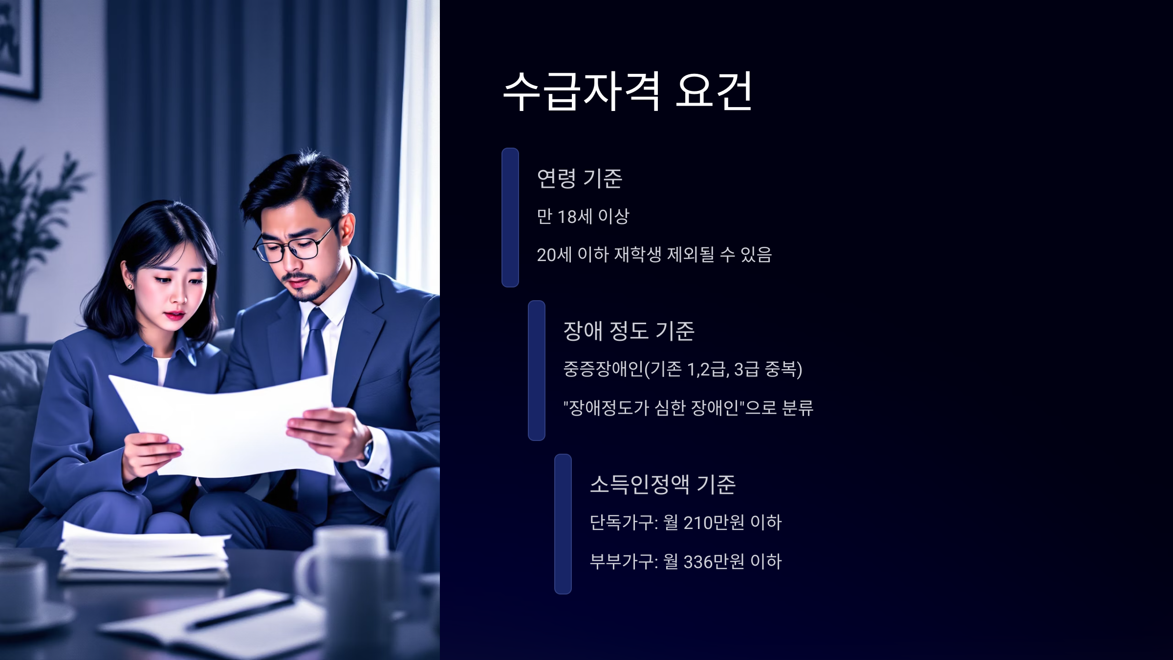 장애인연금 수급자로 선정되기 위해서는 다음의 세 가지 핵심 요건을 모두 충족해야 합니다. 각 요건을 면밀히 검토하시어 본인의 해당 여부를 확인하시는 것이 중요합니다.