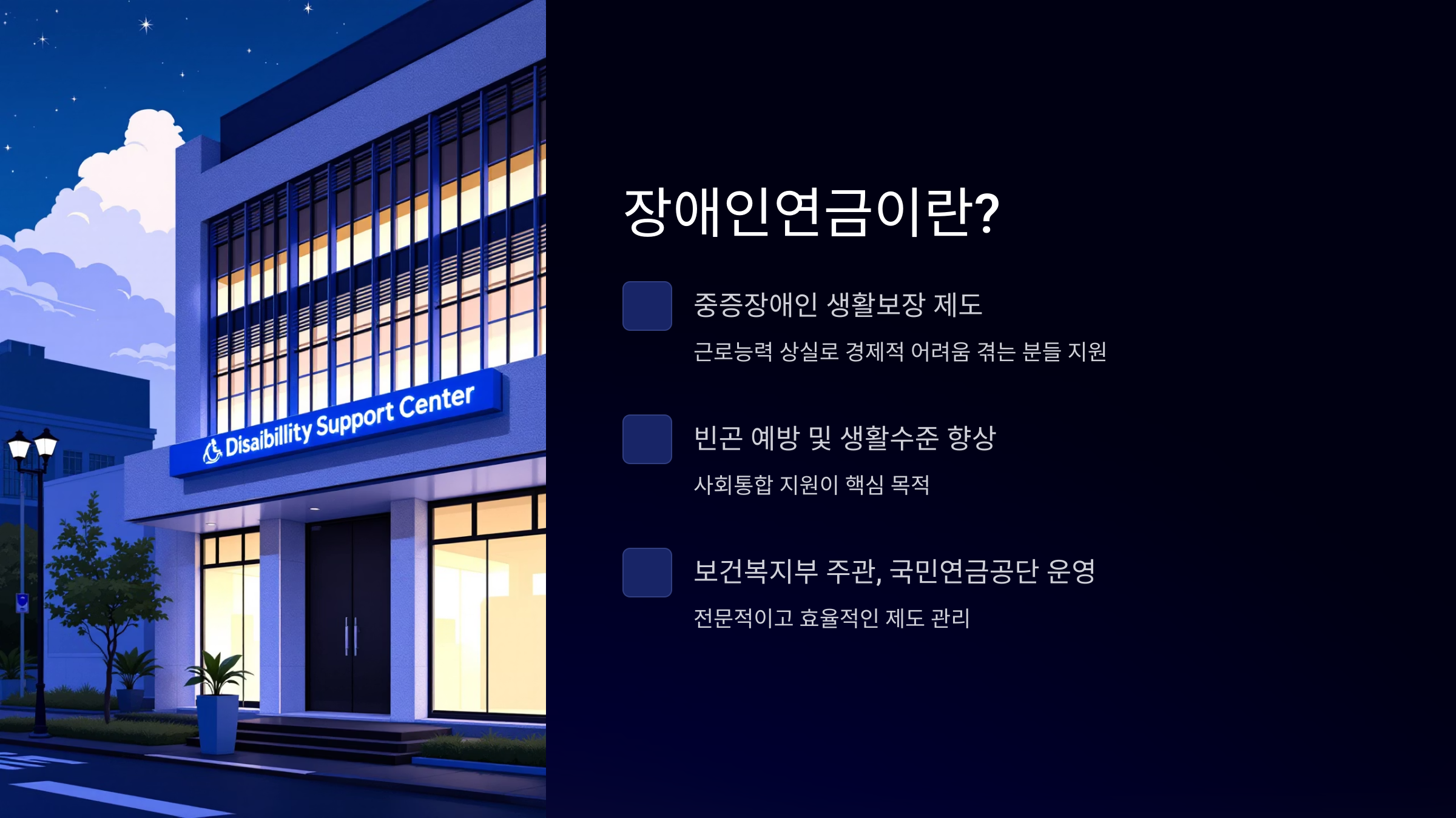장애인연금은 단순히 금전적 지원을 넘어, 중증장애인이 사회의 일원으로서 최소한의 인간다운 삶을 영위할 수 있도록 돕는 데 그 목적이 있습니다. 이는 장애로 인한 추가적인 비용 부담을 완화하고, 경제적 자립 기반을 마련하는 데 기여합니다. 따라서 이 제도는 개인의 복리 증진뿐 아니라 사회 전체의 안정성 강화에도 중요한 역할을 수행합니다.
