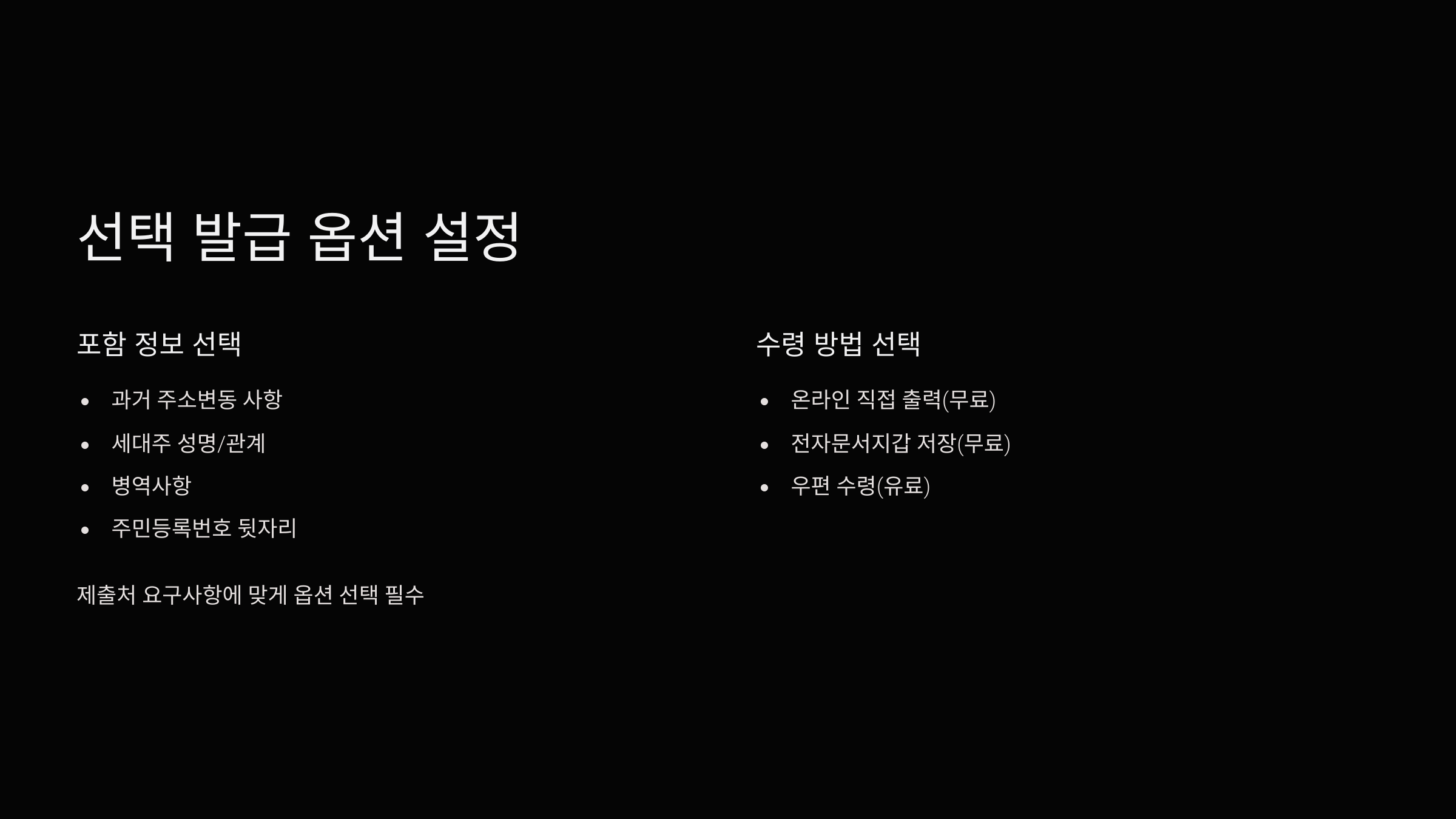 - 선택 발급 옵션 상세 설정: 이 부분이 가장 중요합니다! 제출처의 요구사항에 맞춰 신중하게 선택해야 합니다.