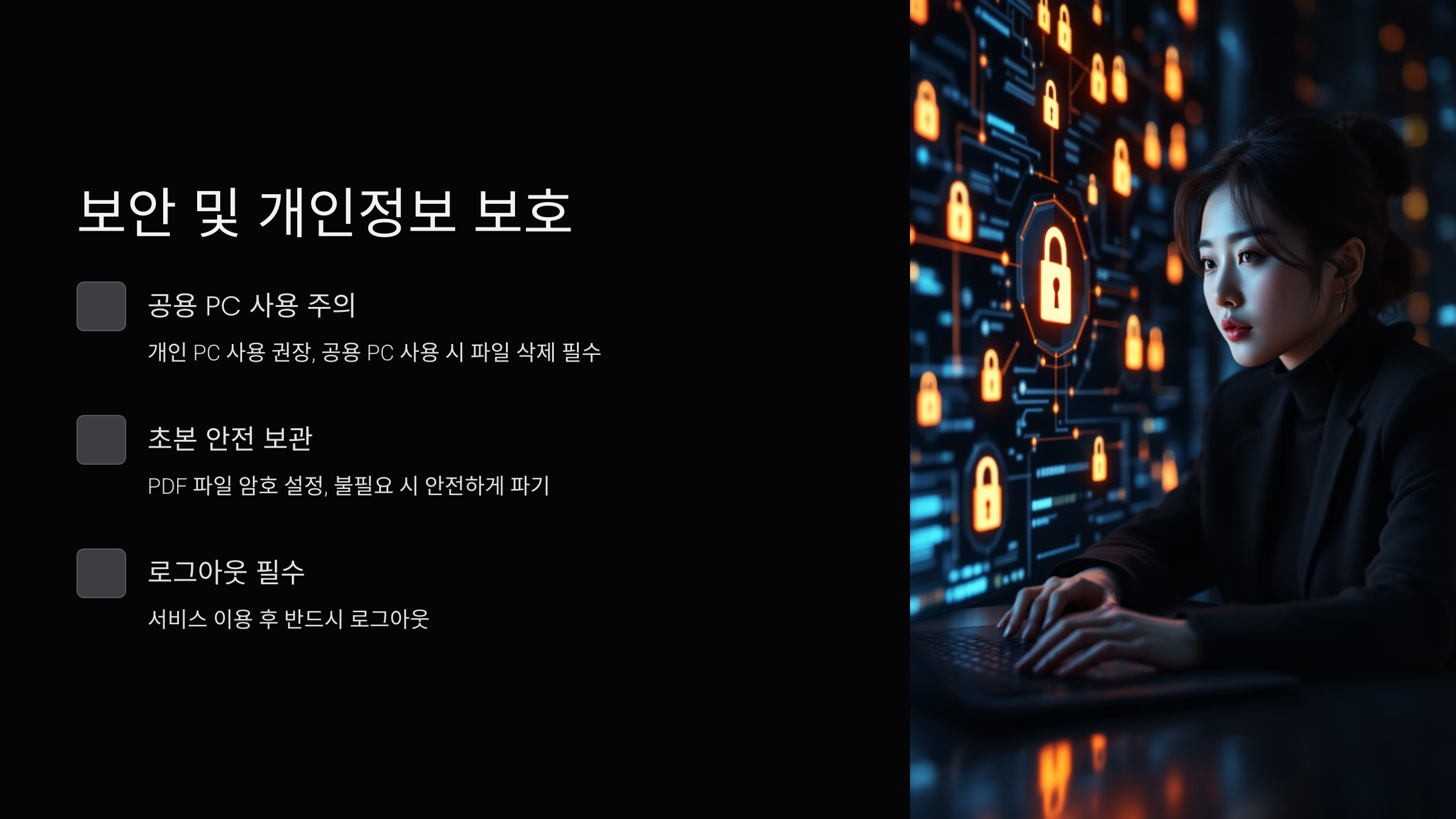 - 공용 PC 사용 지양: 가급적 개인 소유의 안전한 PC를 사용하십시오. 공용 PC 사용 시에는 발급받은 PDF 파일 및 인증서 관련 정보(캐시 등)를 반드시 완전히 삭제하고, 브라우저를 종료해야 합니다.
