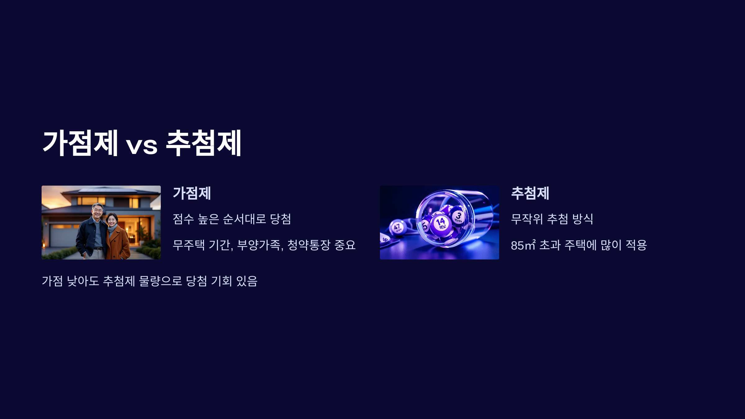 가점제는 무주택 기간, 부양가족 수, 청약통장 가입 기간을 기준으로 점수를 매겨 높은 순서대로 당첨자를 정하는 방식이에요. 반면 추첨제는 말 그대로 무작위로 당첨자를 뽑는 방식이라, 누구에게나 기회가 있어요.