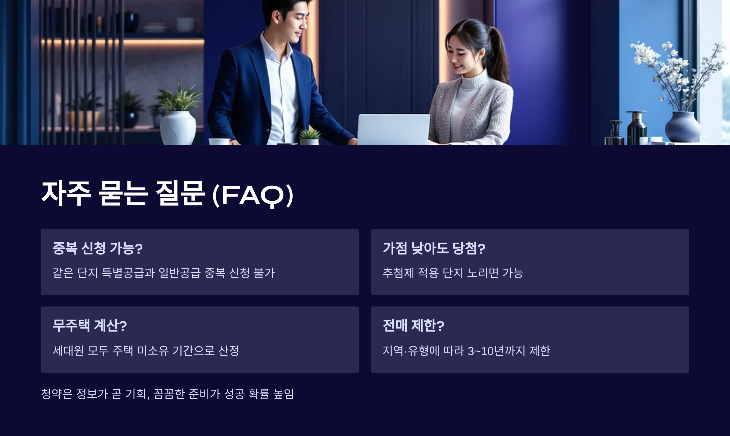 반면 가점이 낮거나, 결혼한 지 얼마 안 된 신혼부부, 자녀가 셋 이상인 다자녀가구, 생애최초 주택 구입자라면 특별공급을 우선 노리는 게 좋아요. 경쟁률이 낮고 추첨제도 병행되는 경우가 많아 확률이 높아요.