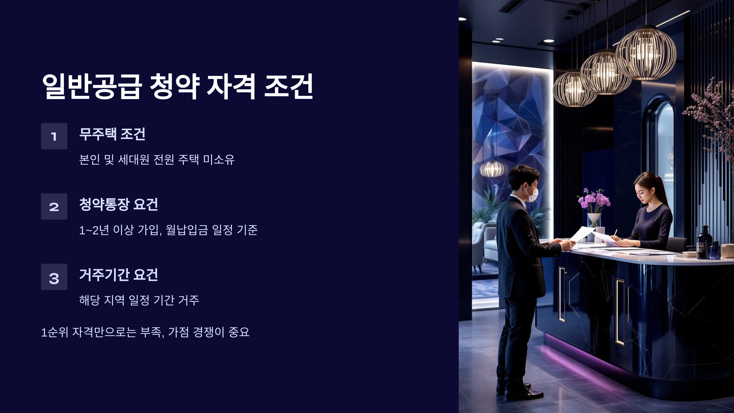 일반공급은 말 그대로 특별한 조건 없이 누구나 신청 가능한 방식이지만, 실제로는 자격 요건이 매우 엄격해요. 특히 수도권, 인기 지역의 경우 경쟁이 치열하기 때문에 기본 자격만 갖췄다고 해서 당첨되기 어렵죠.