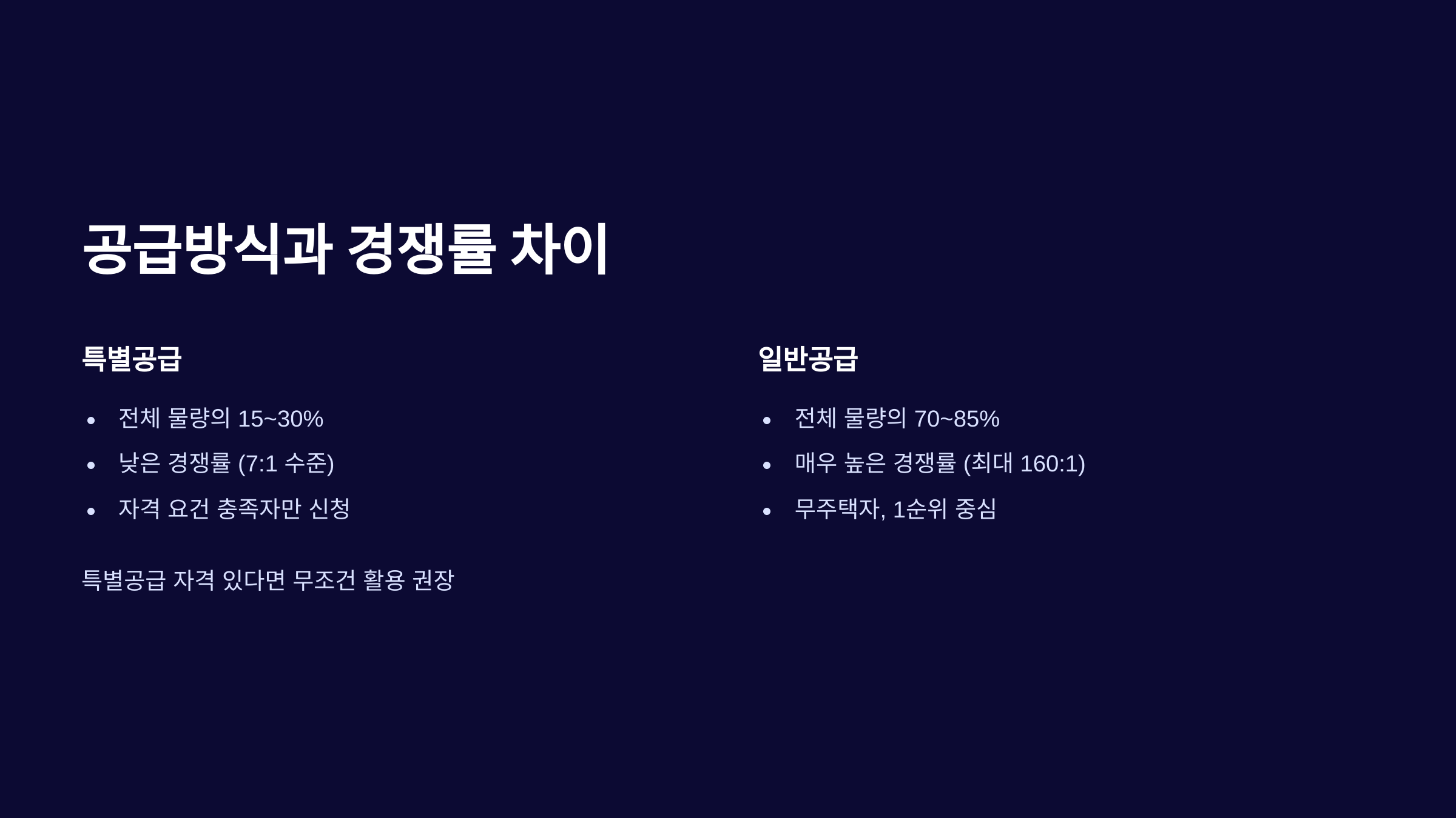 특별공급과 일반공급은 같은 아파트의 분양이지만 시작선 자체가 다르기 때문에, 본인의 상황에 맞춰 전략적으로 접근하는 것이 중요해요. 🎯