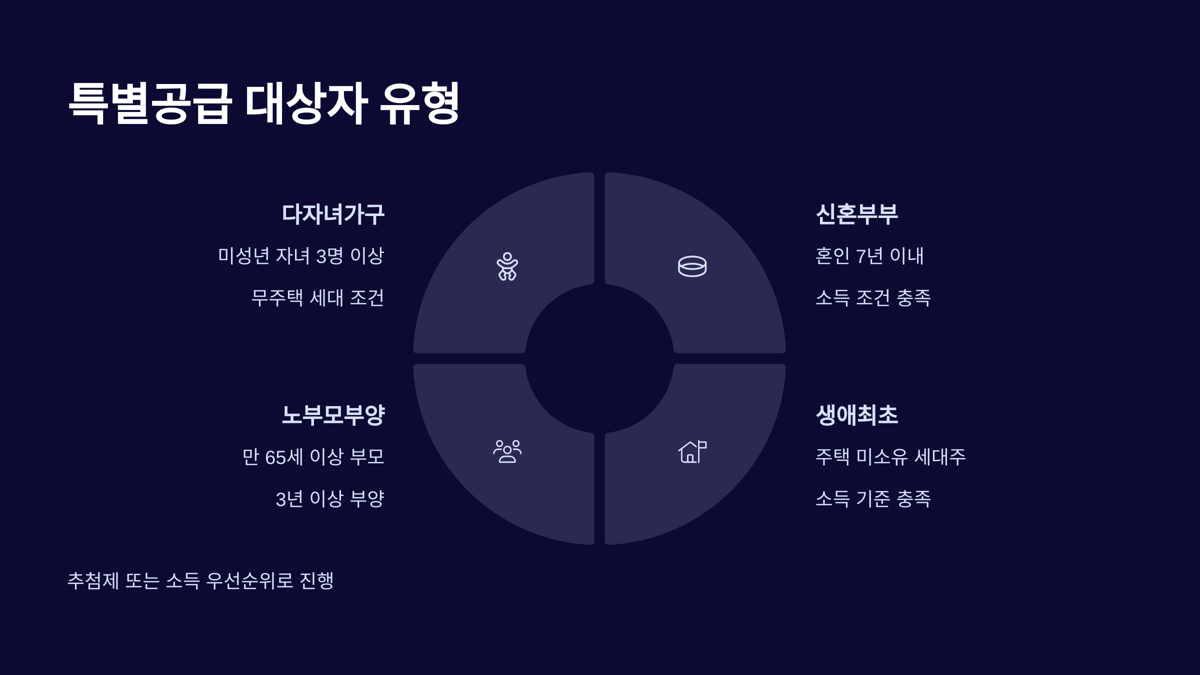 특별공급은 이름처럼 ‘특별한 조건을 충족한 사람’에게만 기회를 제공해요. 정부는 사회적 배려가 필요한 계층이나 주거 안정이 필요한 사람들에게 우선권을 주기 위해 이 제도를 운영하고 있어요. 생각보다 많은 유형이 있기 때문에 자신이 해당하는지 꼭 확인해보는 게 좋아요.