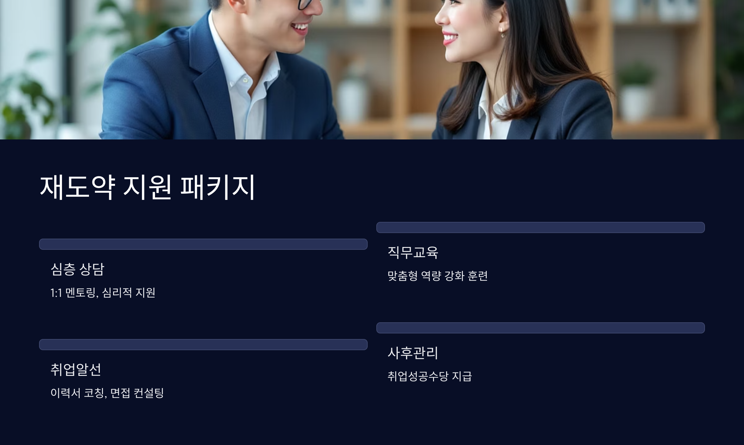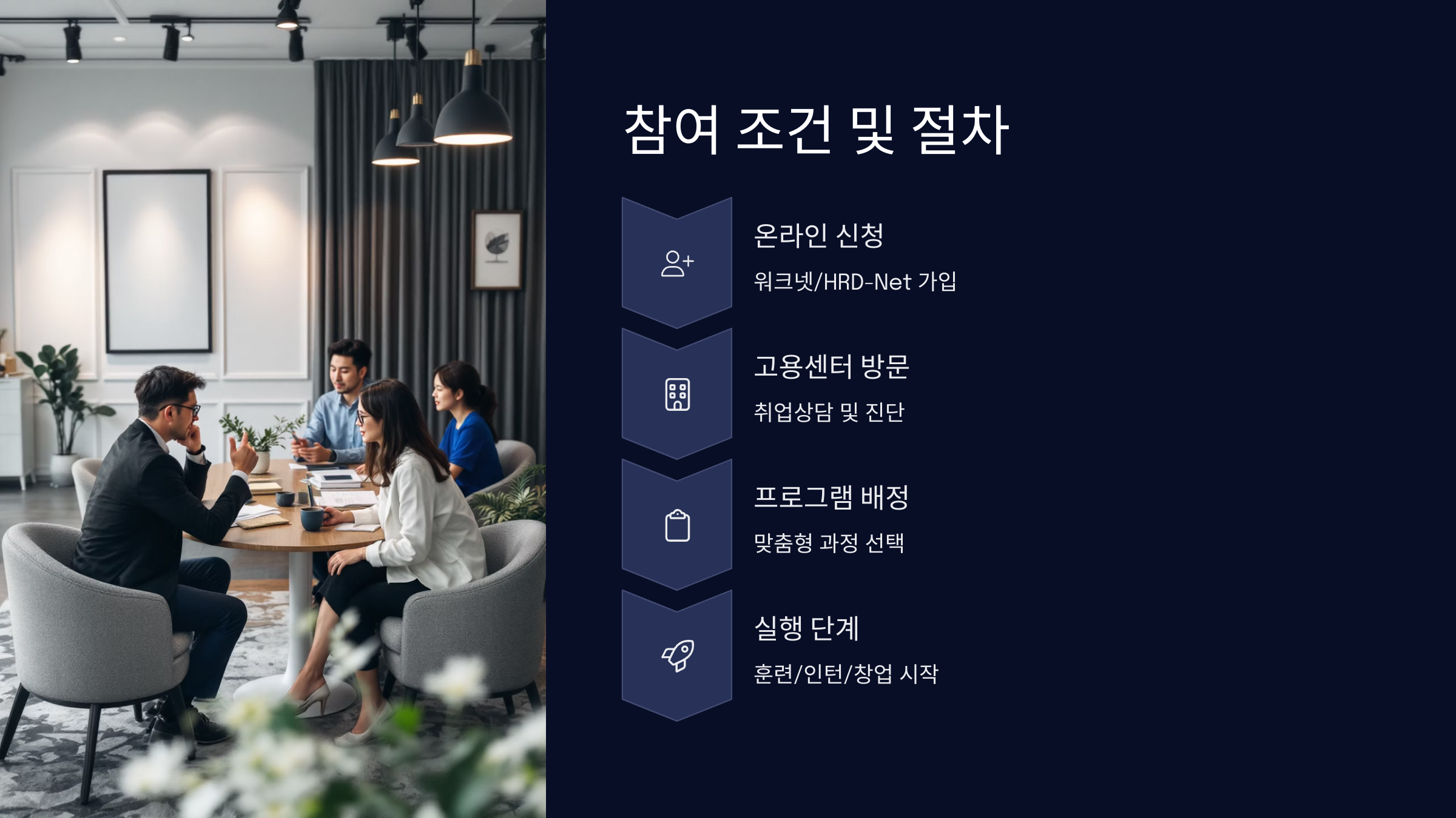 이 제도는 크게 ‘심층 상담 → 직무교육 → 취업알선 → 사후관리’의 4단계로 구성돼 있어요. 각 단계마다 개인의 상황과 역량에 맞는 맞춤형 경로가 제공되며, 특히 심리적 불안감 해소와 경력 재정비를 위한 1:1 멘토링도 포함돼요.