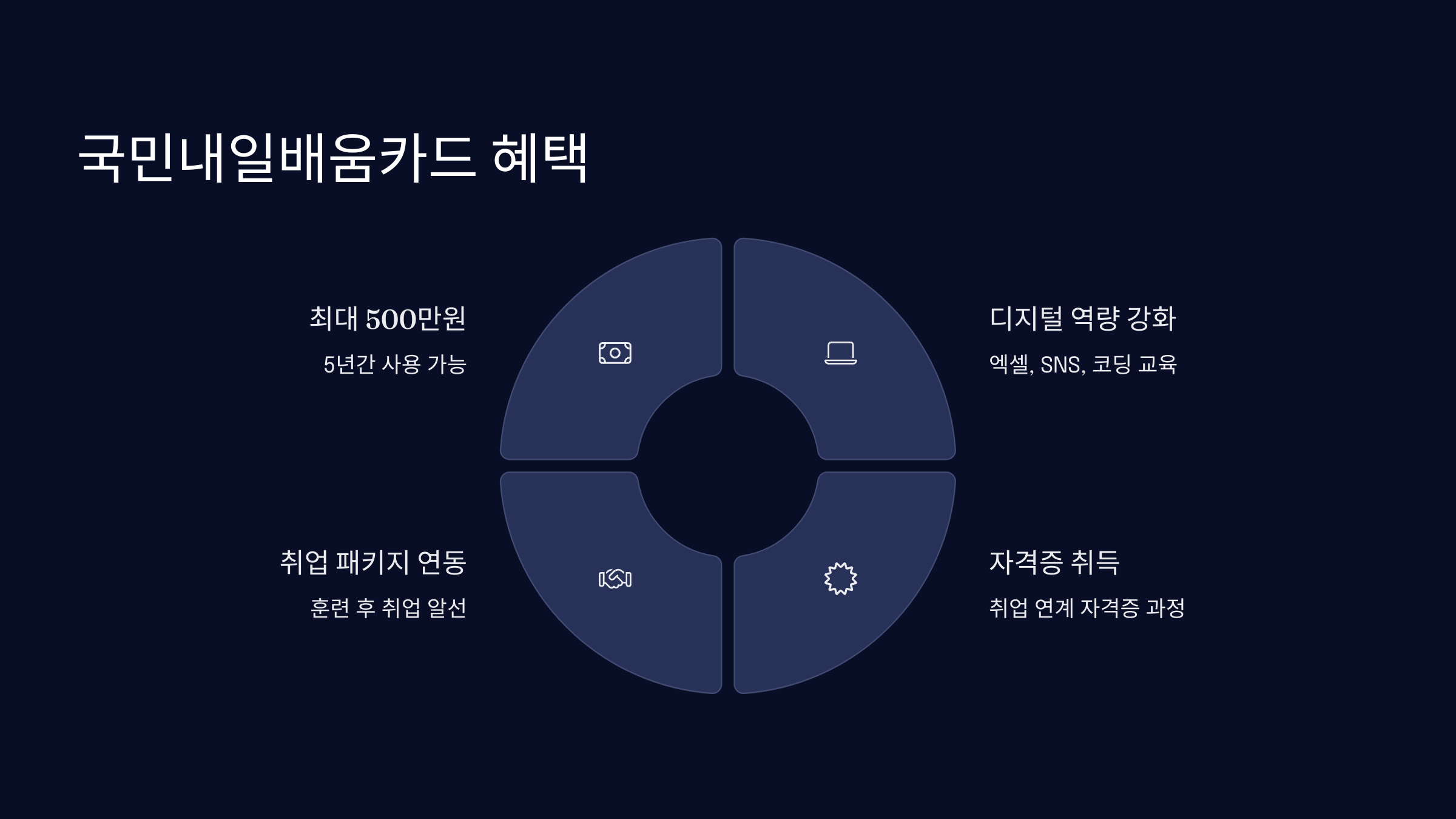 2025년부터는 ‘디지털 역량 강화’ 과정도 포함되어 있어서, 엑셀, 컴퓨터 활용능력, SNS 마케팅, 간단한 코딩 등의 강의도 카드로 수강할 수 있어요. 이는 중장년층이 최신 기술 흐름에 뒤처지지 않도록 돕기 위한 정책 변화예요.