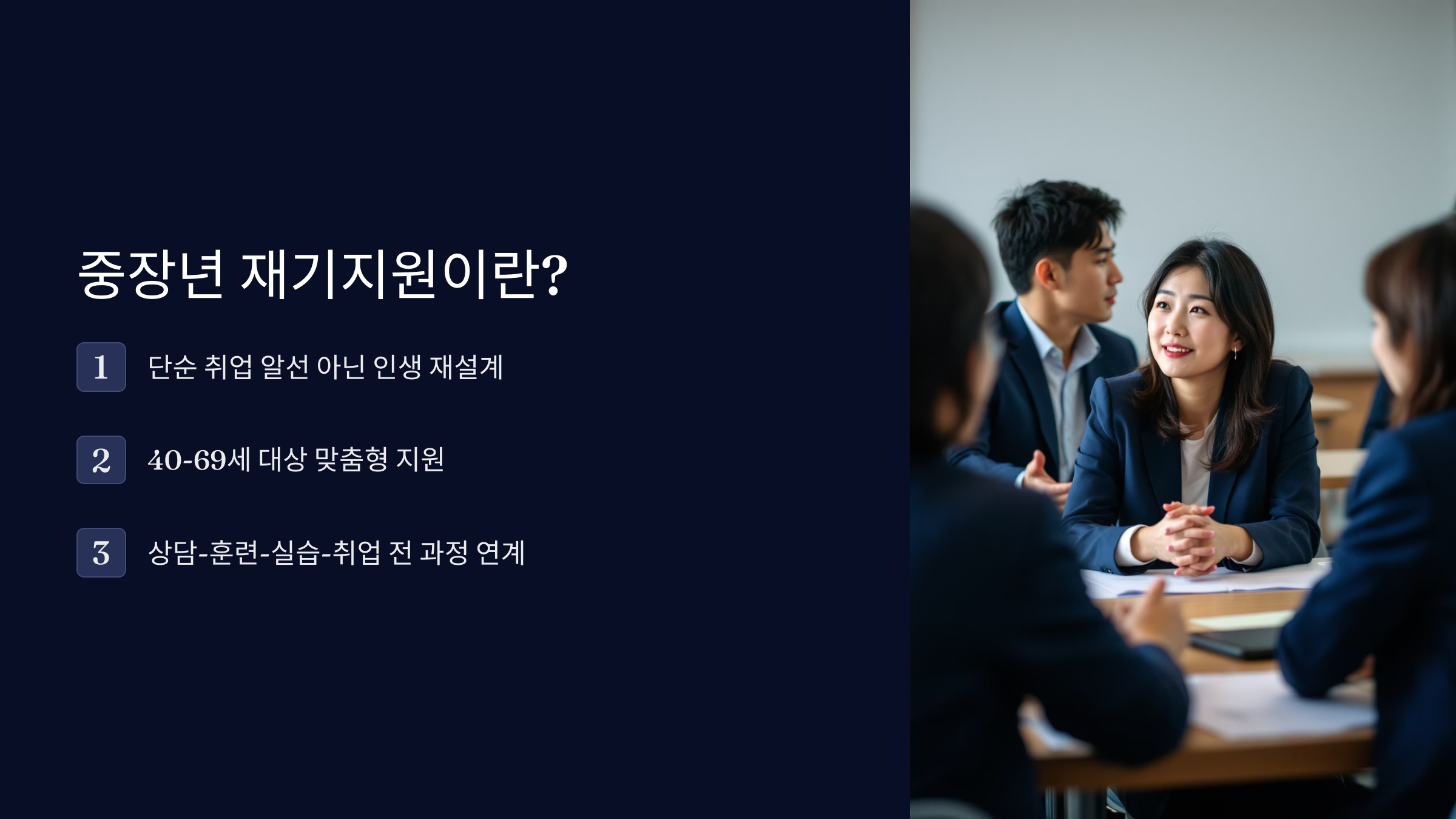 중장년층은 오랜 사회생활로 축적된 경험이 있는 만큼, 이를 살릴 수 있는 방향의 재기 프로그램이 더 효과적이에요. 그래서 단순한 직업 소개보다는 전문성에 맞춘 매칭이 중요하답니다.