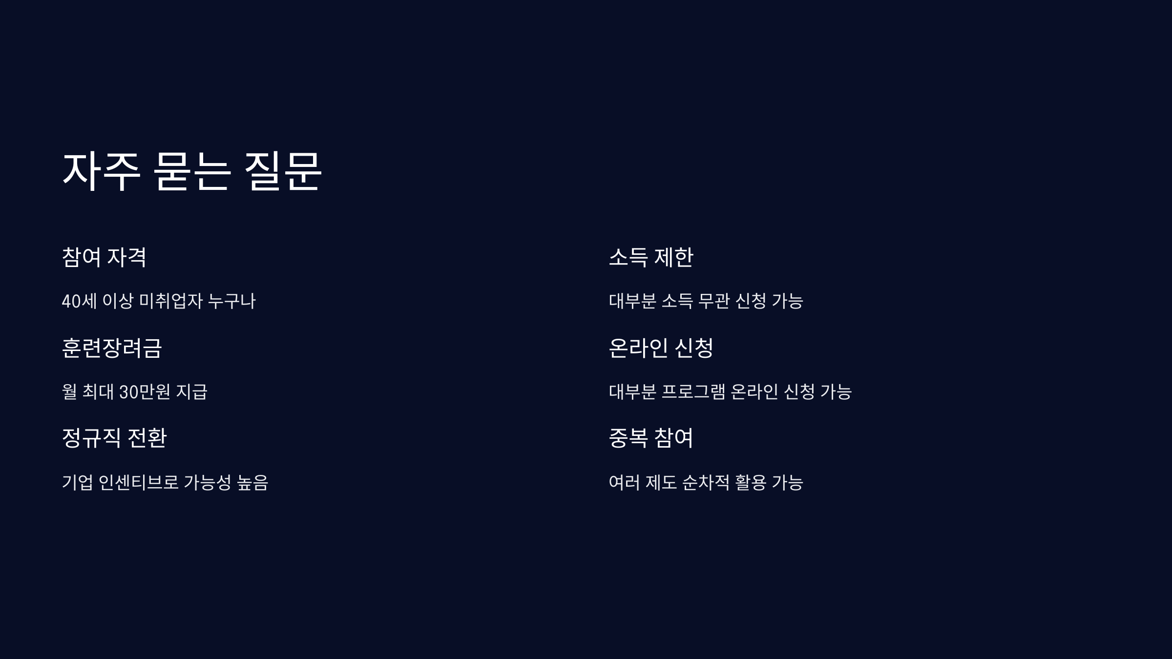| 주요 지원 | 심층상담, 직업훈련, 취업연계, 수당 |