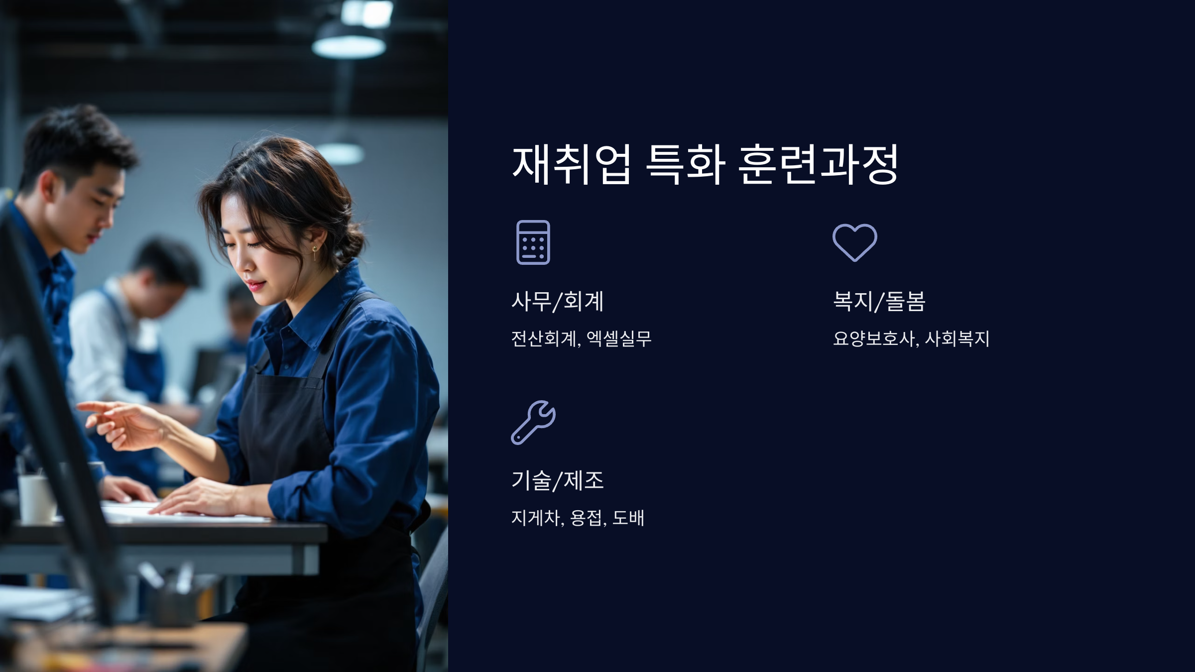 중장년층을 위한 재취업 특화 훈련은 단순한 직업교육이 아니라, 실제 채용 수요가 높은 업종과 직무 중심으로 구성돼 있어요. 나이와 신체 조건, 경력 등을 고려한 실용 중심의 커리큘럼이 마련돼 있어요.