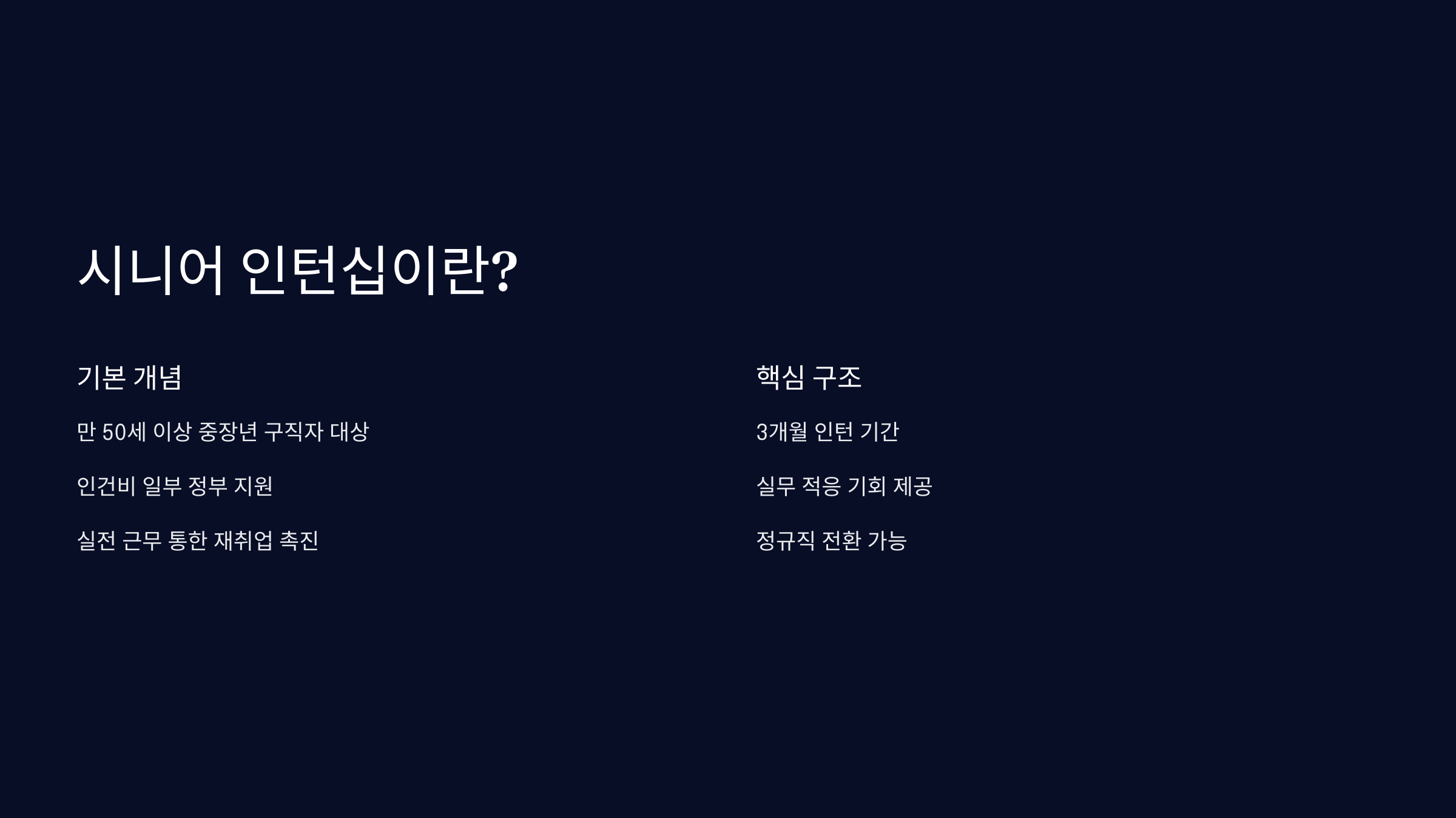시니어 인턴십은 50세 이상 중장년층이 실제 직장에서 인턴으로 근무하며 재취업할 수 있도록 정부가 지원하는 제도예요. 경험과 의지가 있는 중장년 구직자와 인력난을 겪는 중소기업을 연결해주는 가교 역할을 해요.