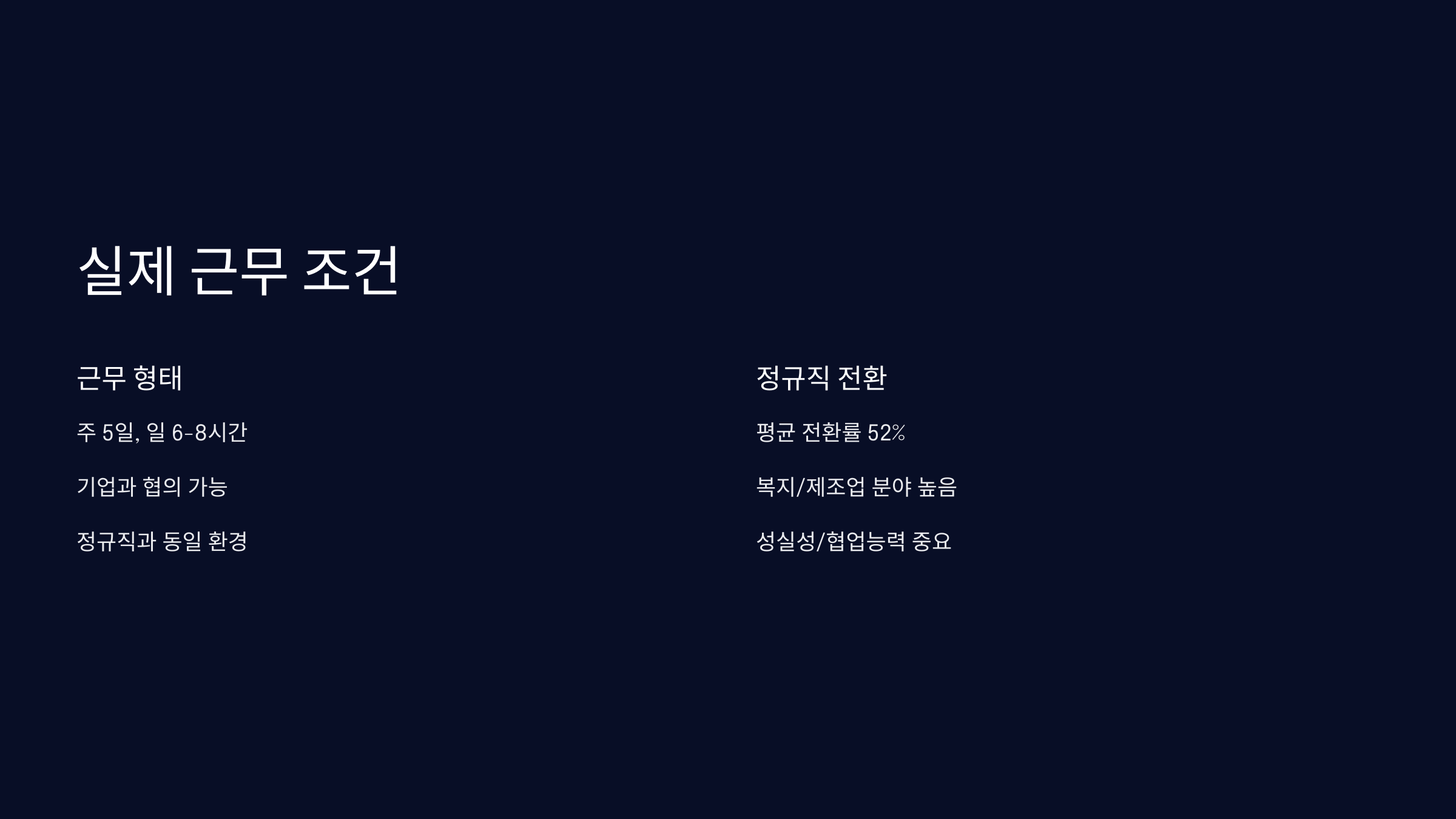 | 정규직 전환률 | 평균 52%, 복지/제조업 분야는 더 높음 |